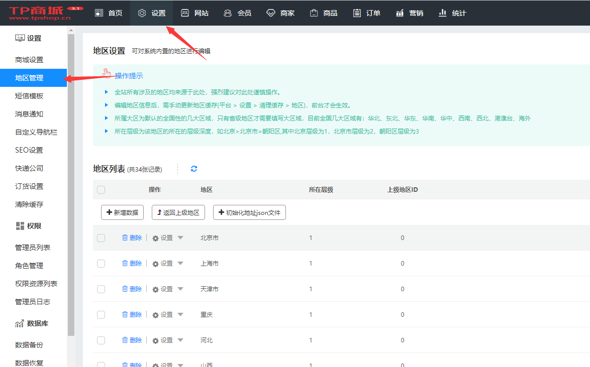 地区基础数据,默认数据都已经是设置好了的,无特殊情况请不要随意编辑。