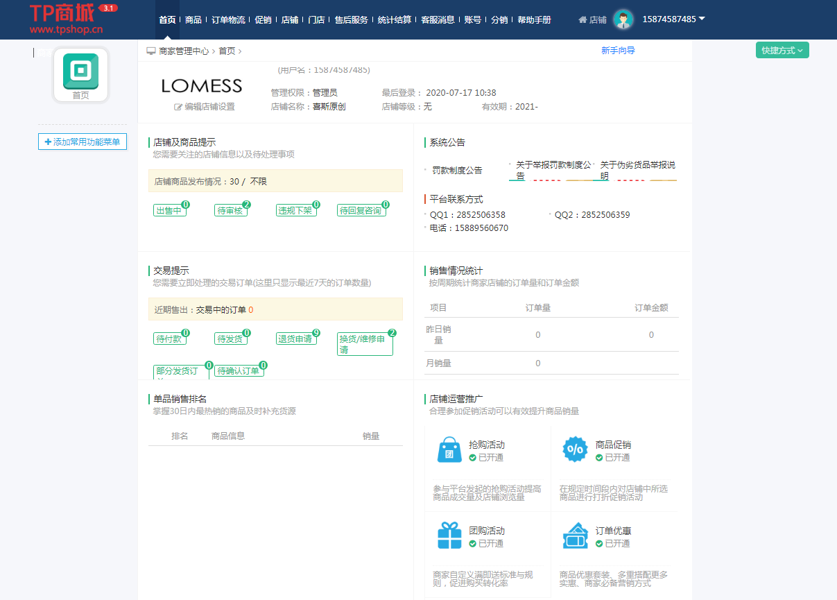 商家账号登录进去就只显示权限下的功能。