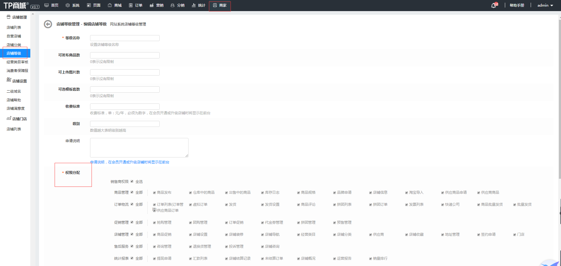 平台如果需要给商家账号设置权限,需要先在店铺等级里设置商家所能操作权限。(商城--商家--店铺等级--新增店铺等级)