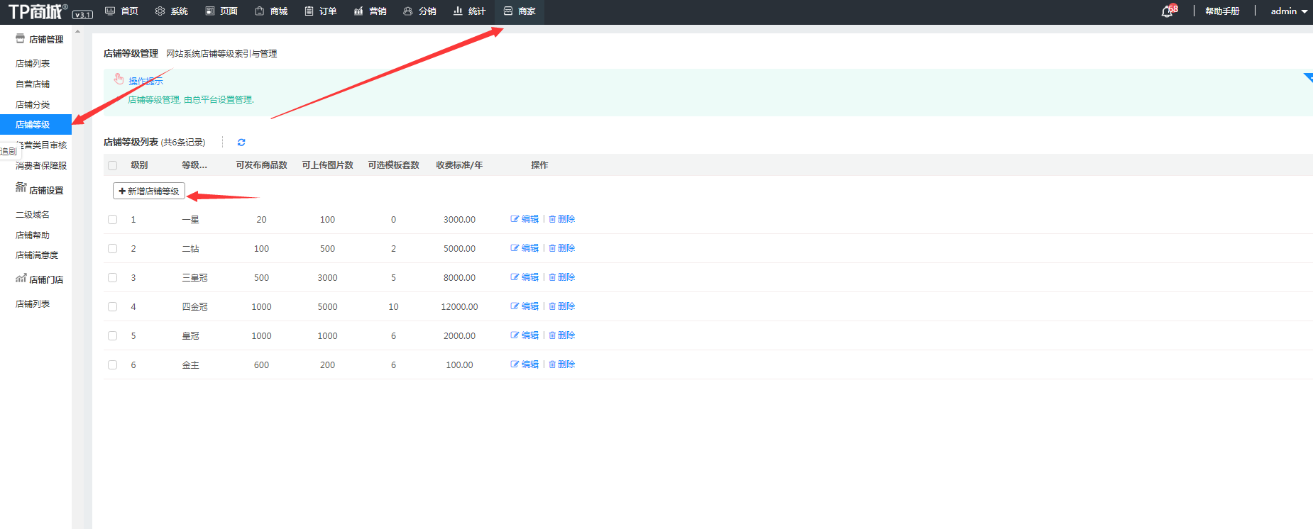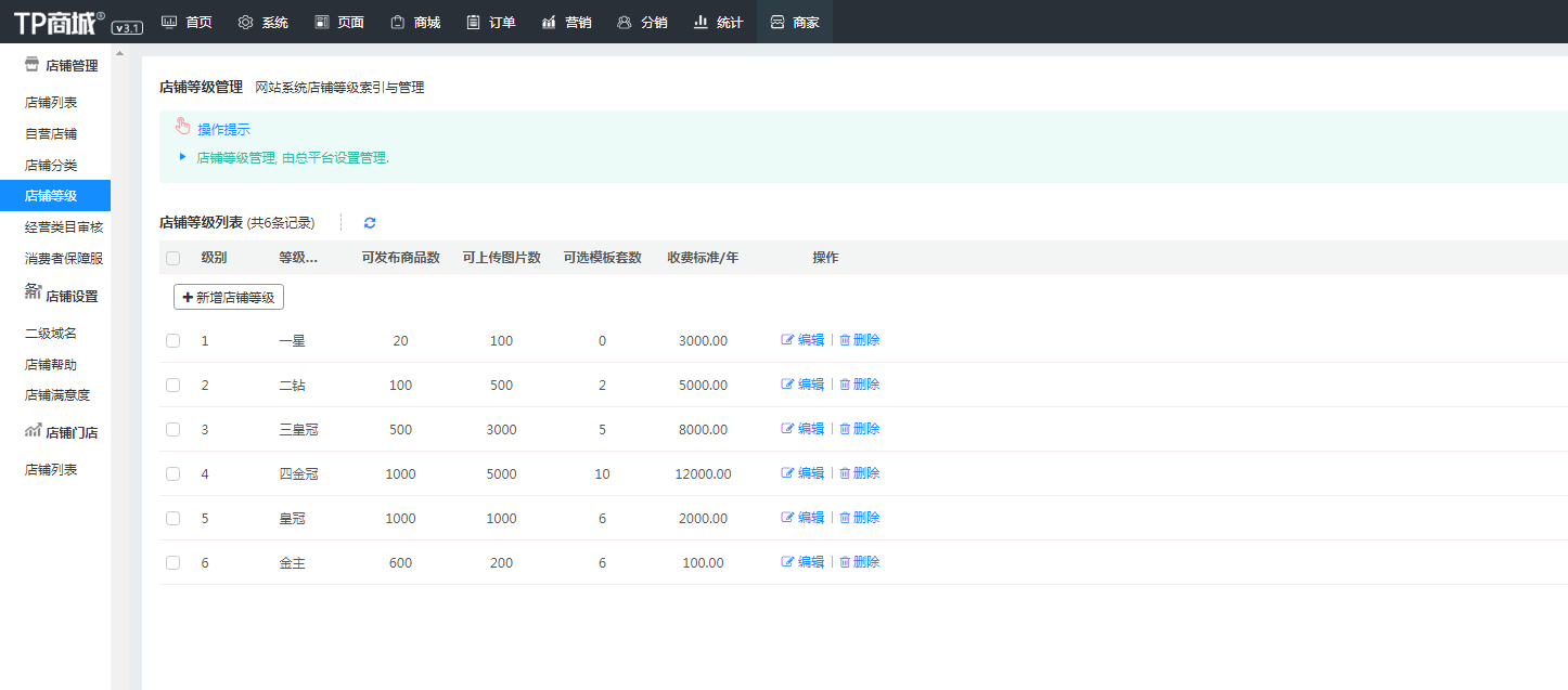 2,然后将店铺指定到店铺等级。
