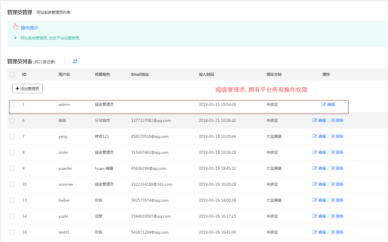 1)、平台新增一个后台操作人员就需要为这个用户分配一个角色, 某个角色有相应的操作权限(超级管理员拥有系统所有操作权限). 给用户分配了角色之后才能做相关的操作.