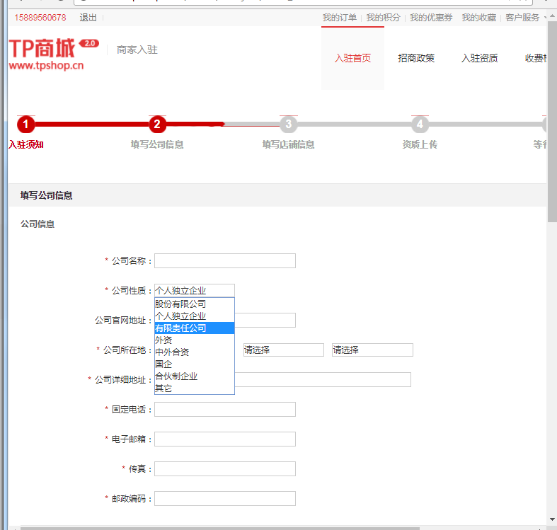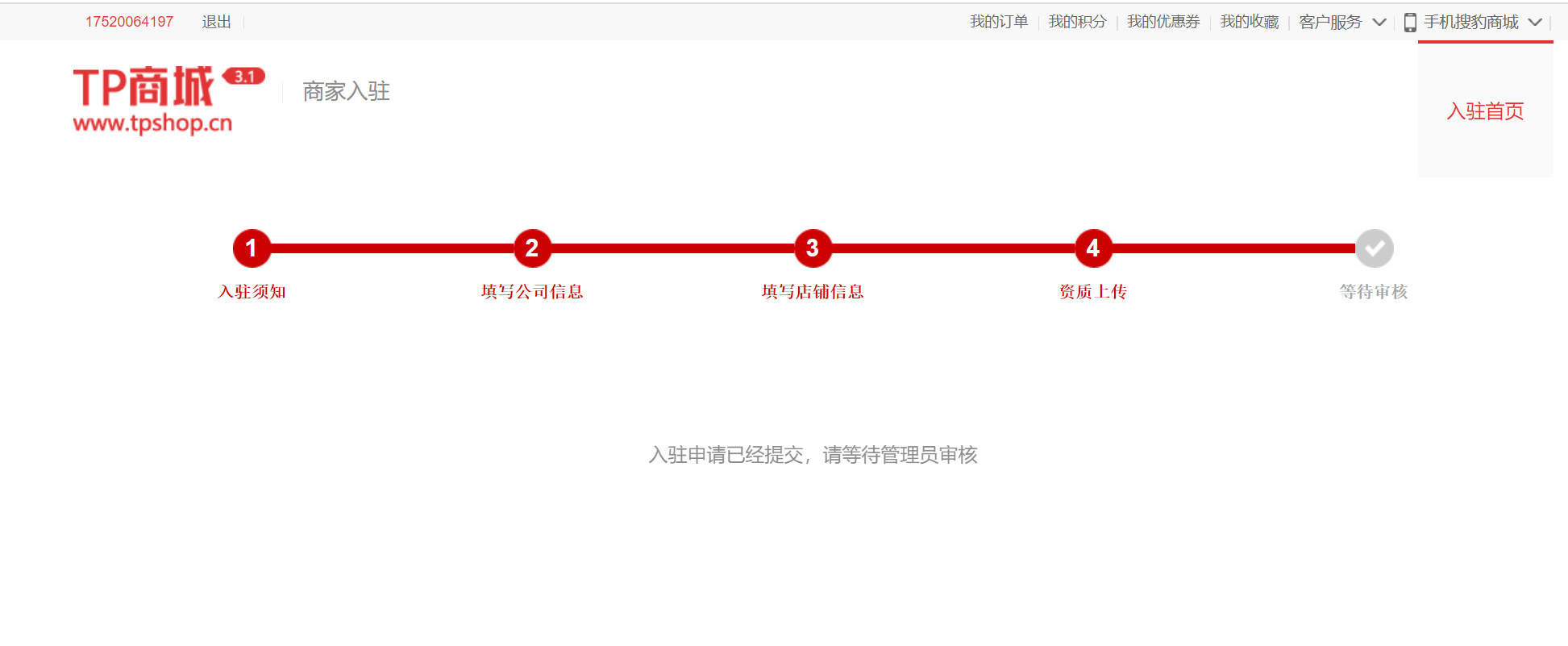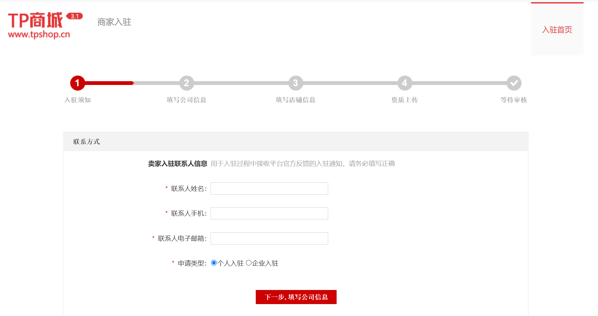 用户如果需要入驻店铺,首先需要在商城注册账号(没有申请过入驻过的账号),填写相关信息,提交到平台审核。
