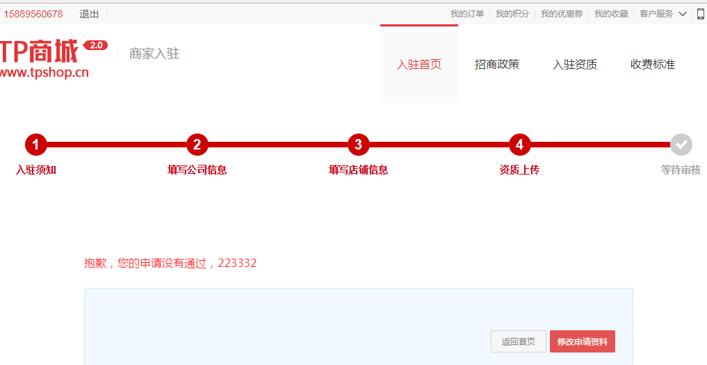 店铺审核失败以后,账号无法登录到店铺,入驻者可通过修改入驻信息重新提交审核。