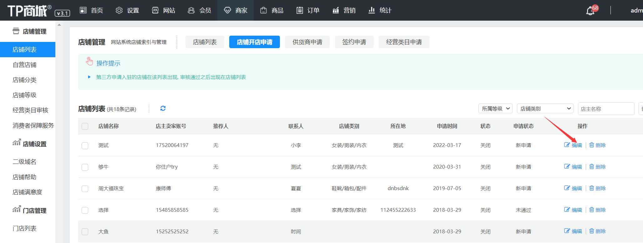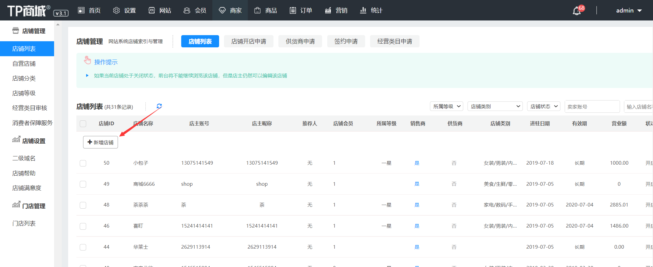 二、后台新增店铺(路径:商家--店铺列表--新增店铺)