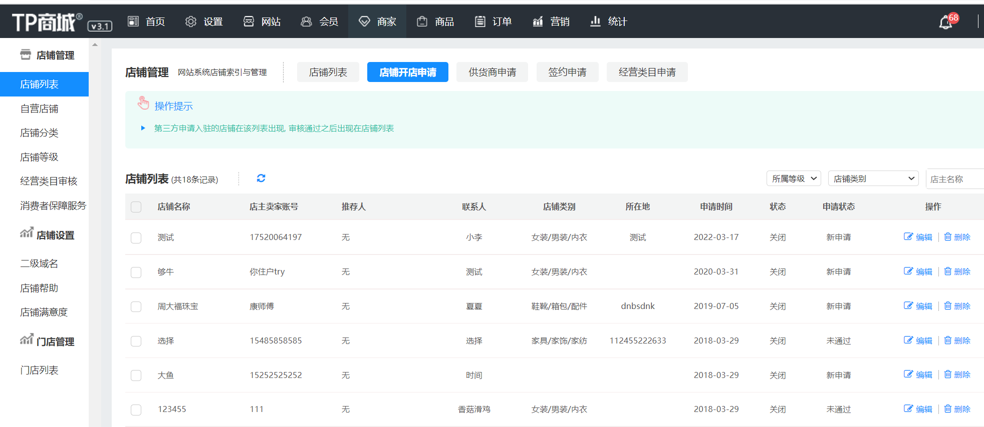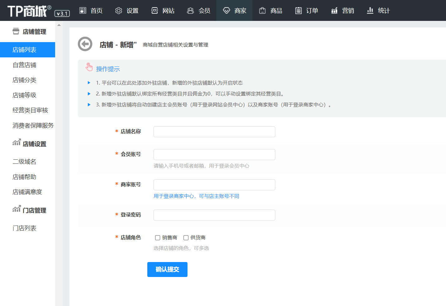 可通过后台新增及前台用户申请这2种方式添加店铺