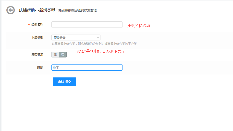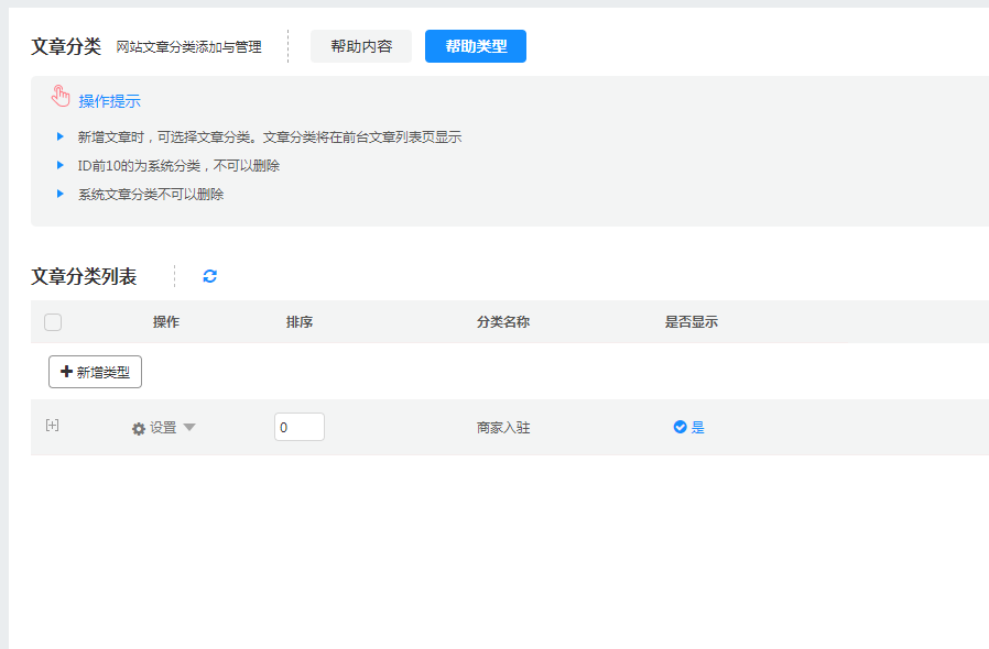 帮助类型类似于帮助分类,每篇帮助文章都需要指定到相关的分类。所以在将帮助文章之前,我们先来设置帮助类型。