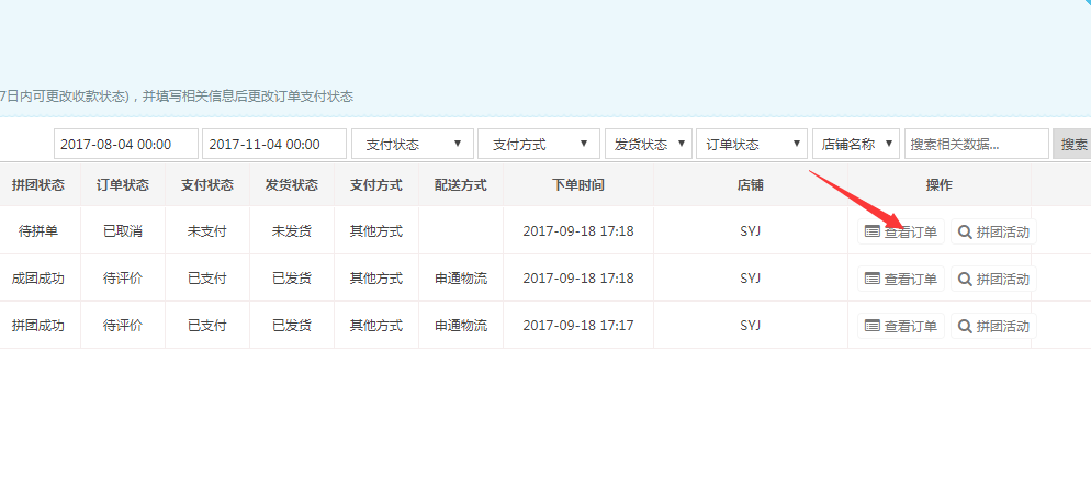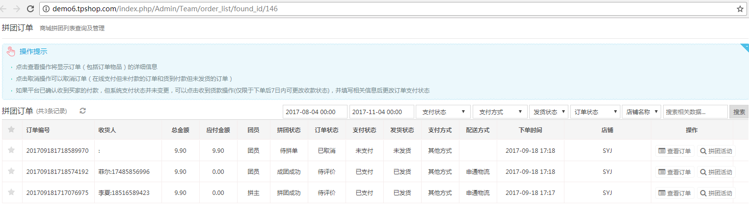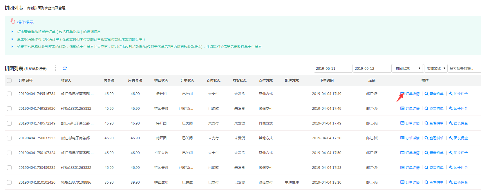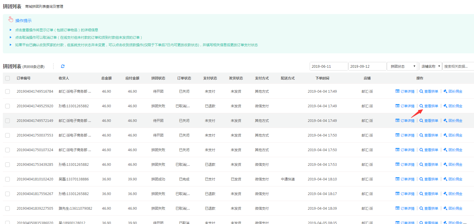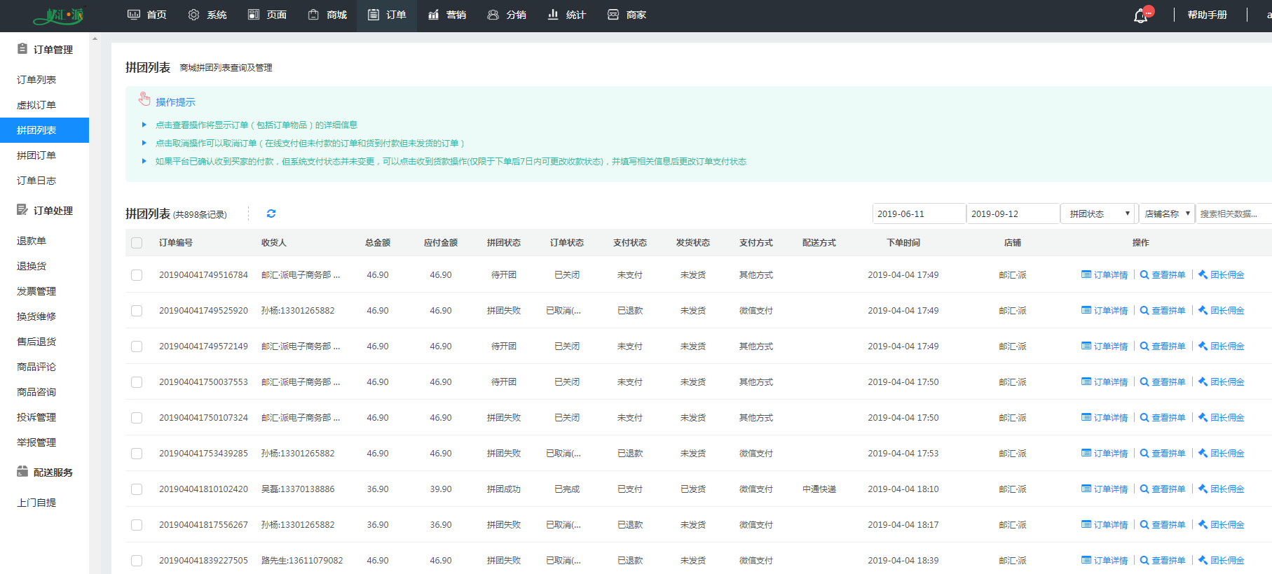 拼团列表页展示所有的拼团团长订单。可查看拼团状态,收货信息,以及订单指定店铺等。