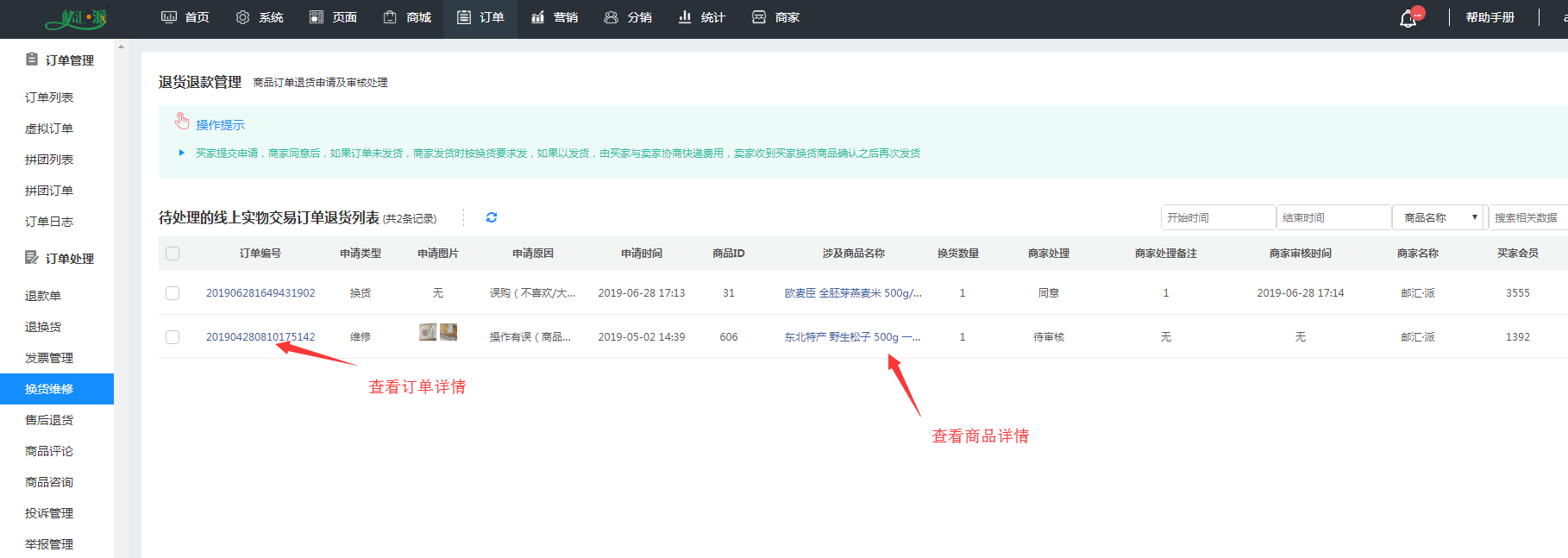 平台可查看用户申请换货原因以及换货商品,以及商家目前处理状态。