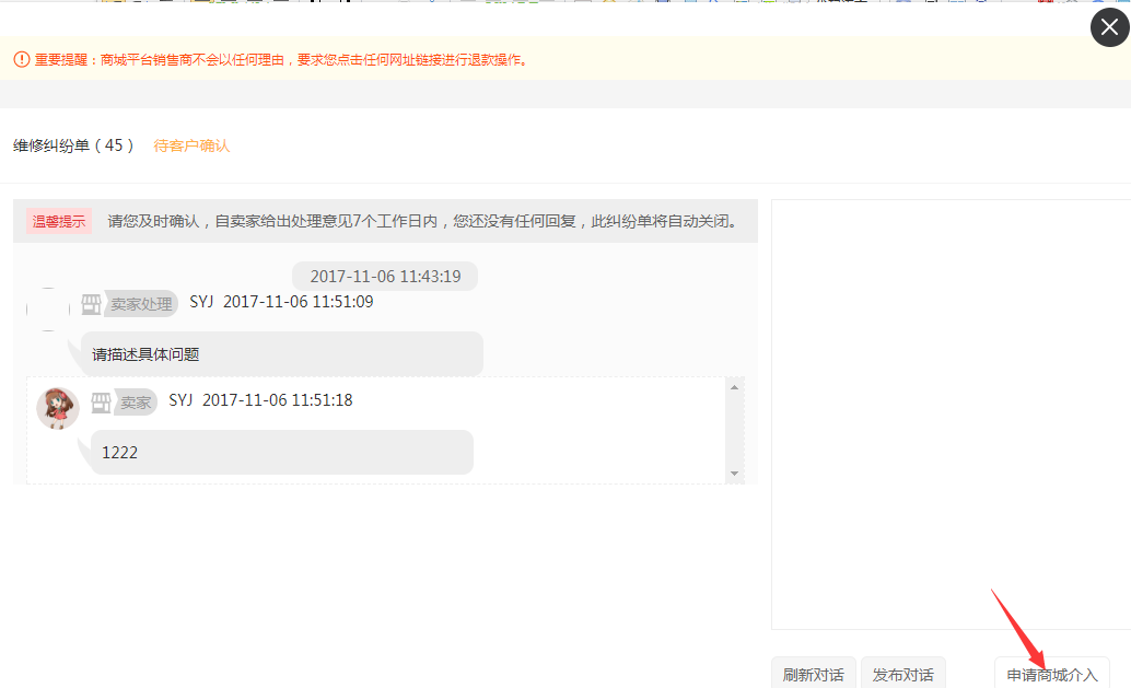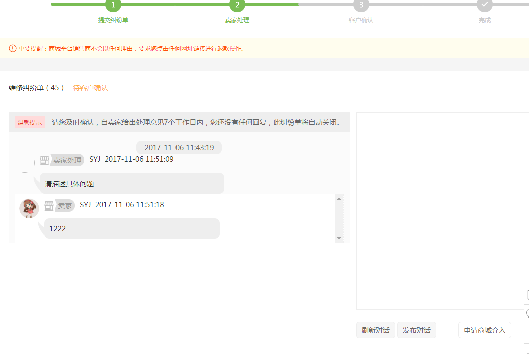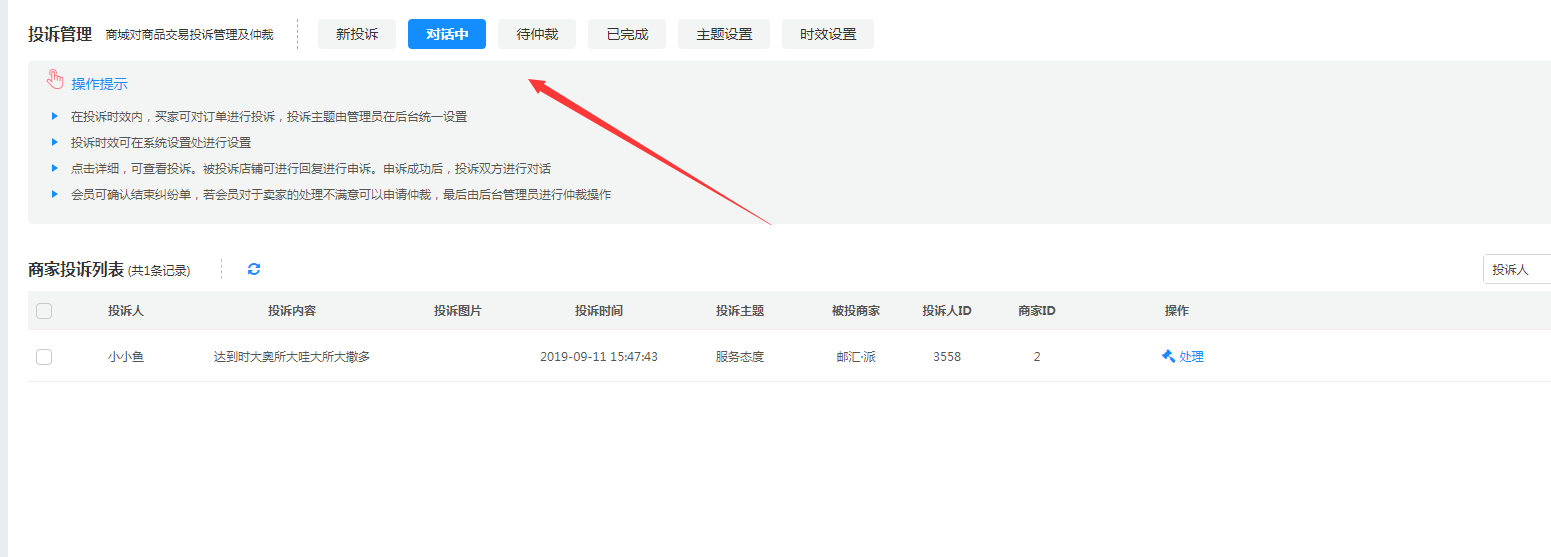 商家与用户沟通过程中,纠纷单状态从待处理到对话中,总平台(商城--订单--投诉管理--对话中)可以查看到该状态的纠纷单。