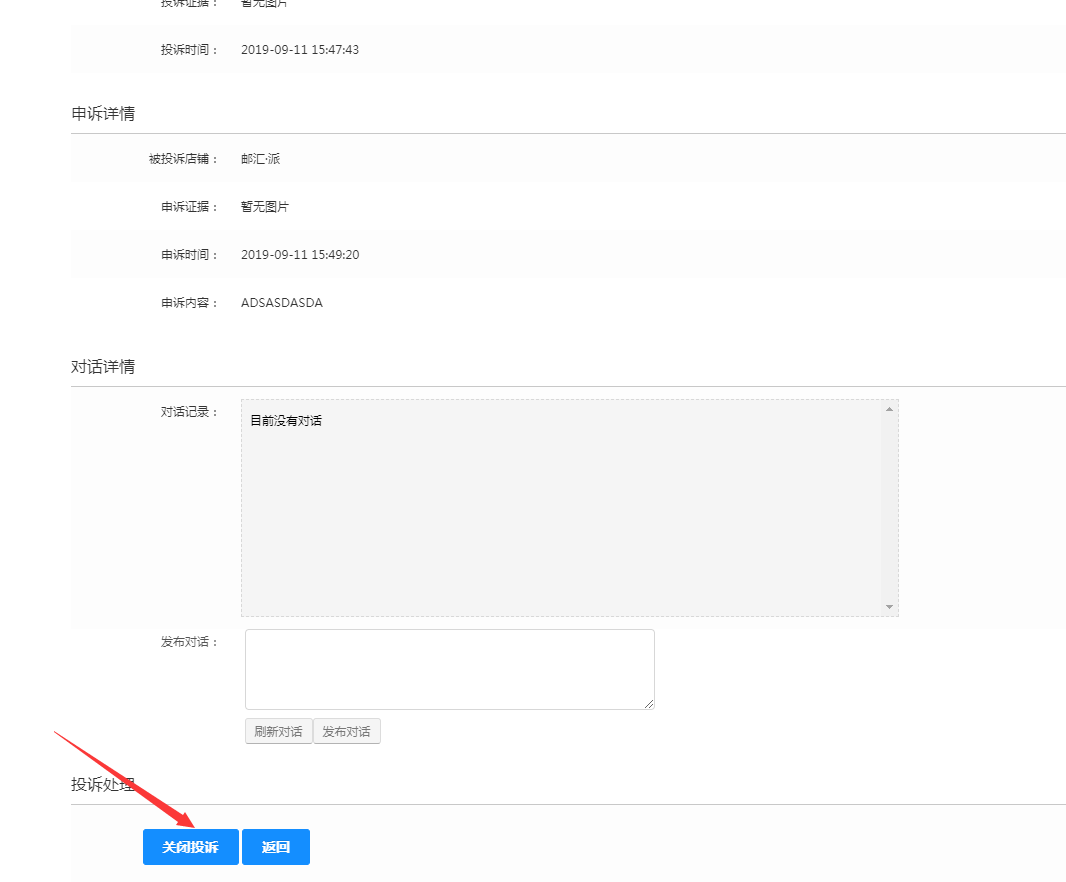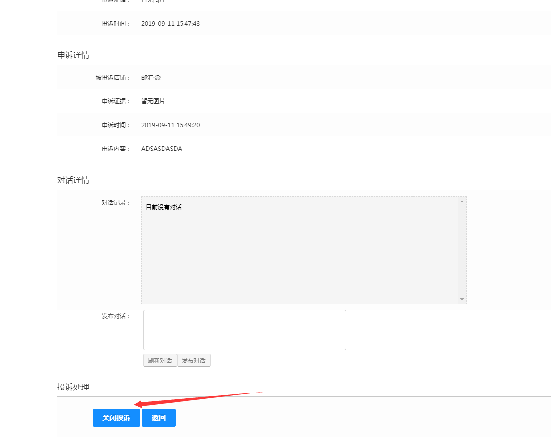 平台可根据用户投诉内容,商家申诉内容,给出仲裁结果,既而关闭纠纷单。
