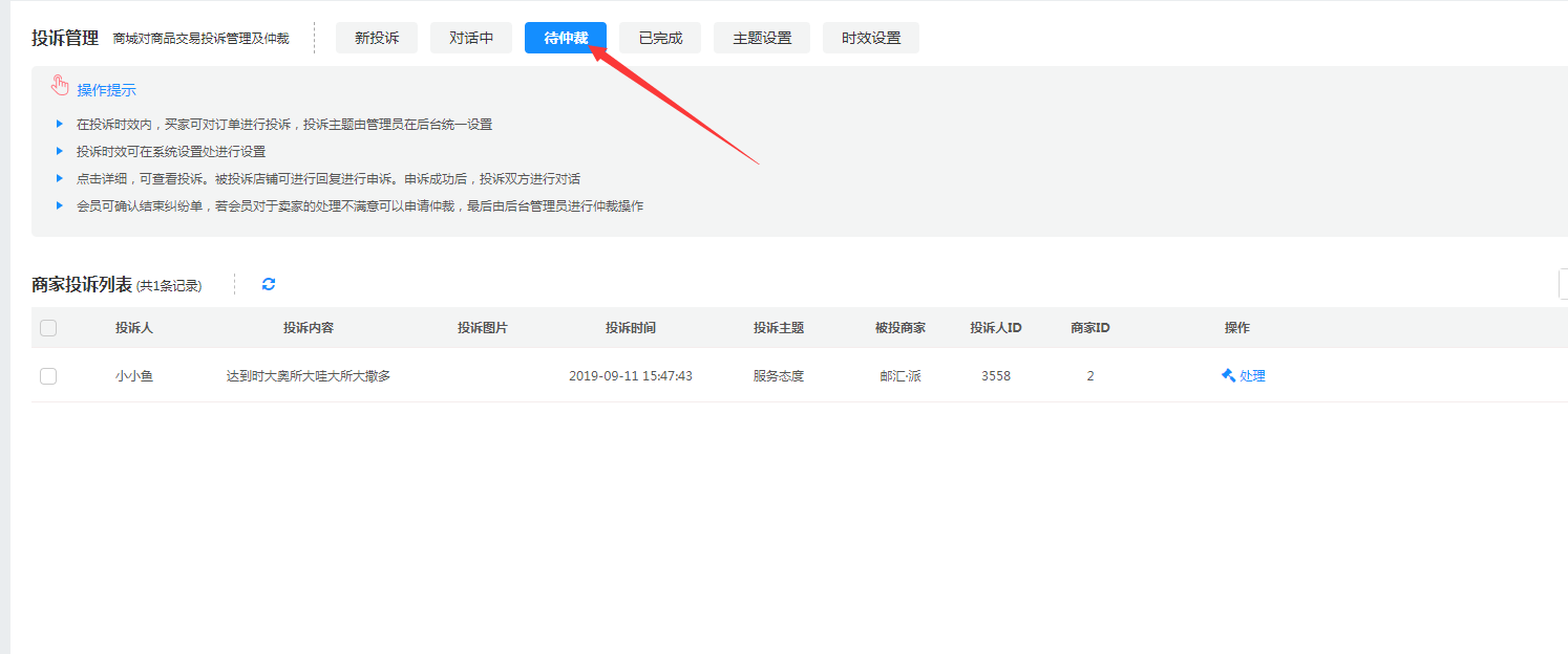 在用户申请商城入介入以后,纠纷单进入待仲裁列表。