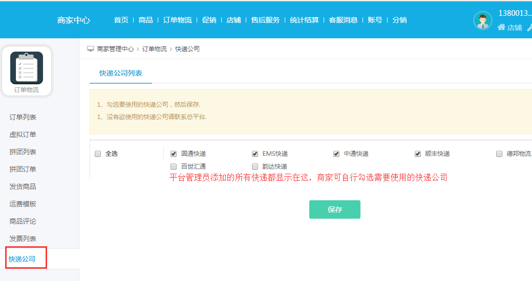 参数设置完成以后,商家中心就可以勾选可使用的物流公司了【商家中心--订单物流--快递公司】