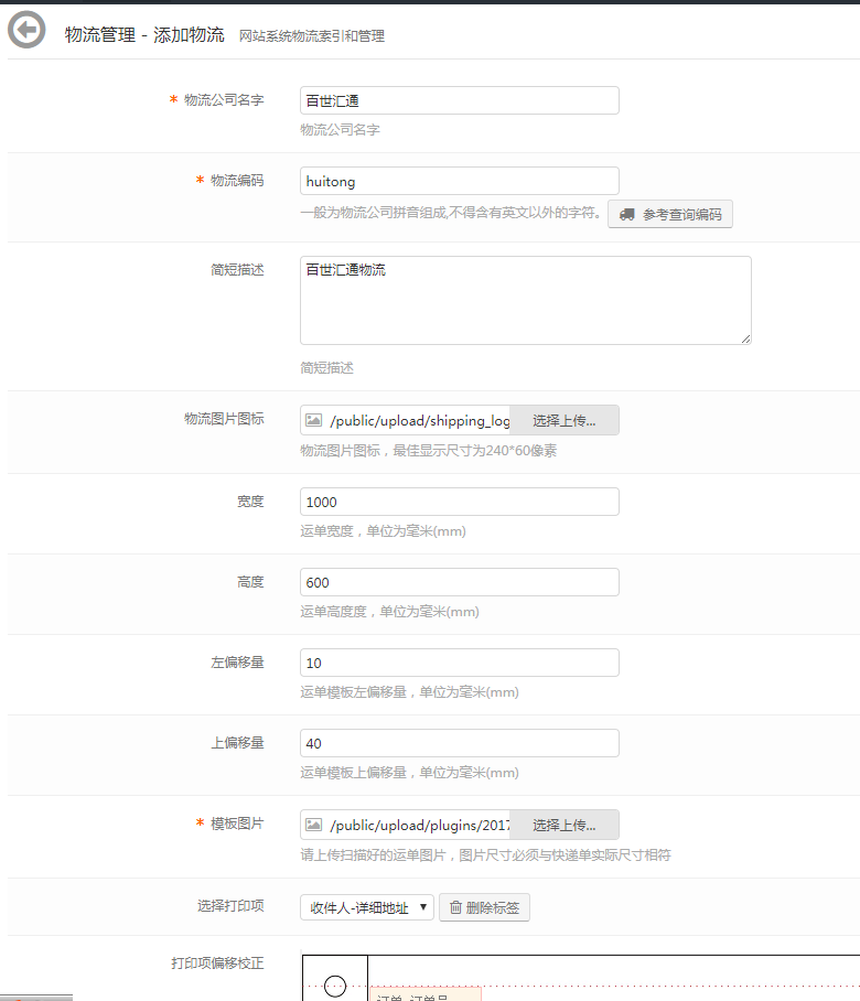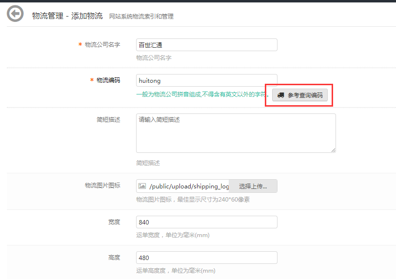 (2),物流编码,参考查询编码。必须填写正确,否则会影响到商城物流信息显示。