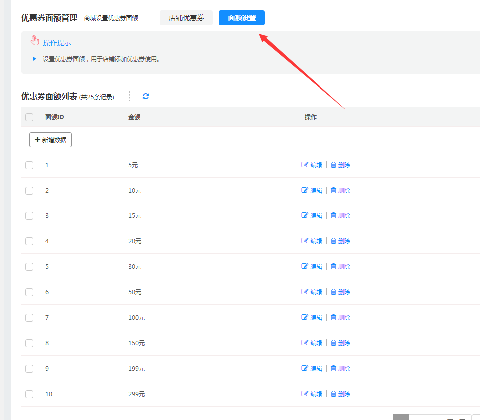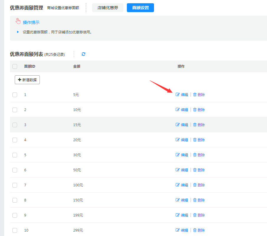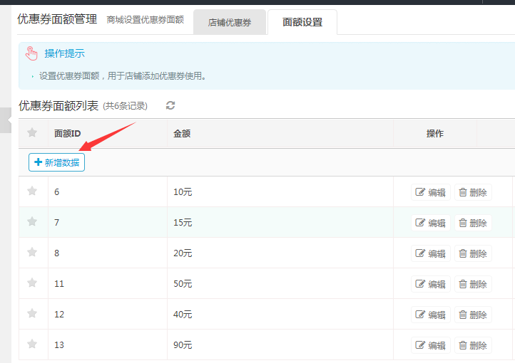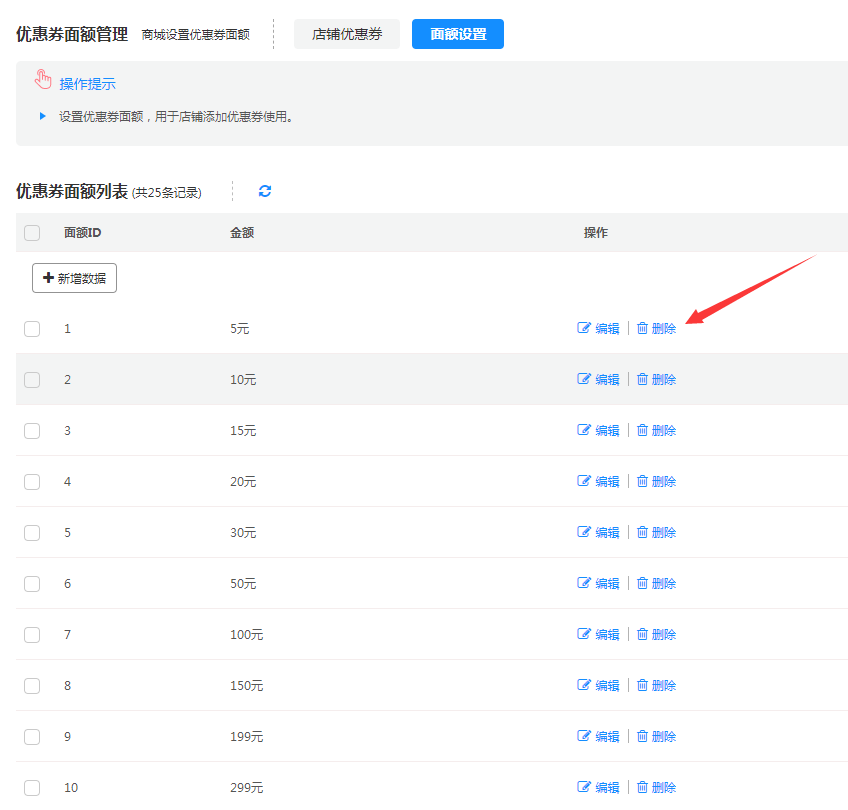 (2)删除优惠券面额(优惠券面额删除以后,商家中心就不能使用了)