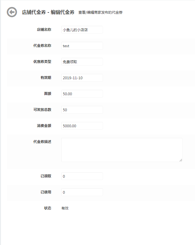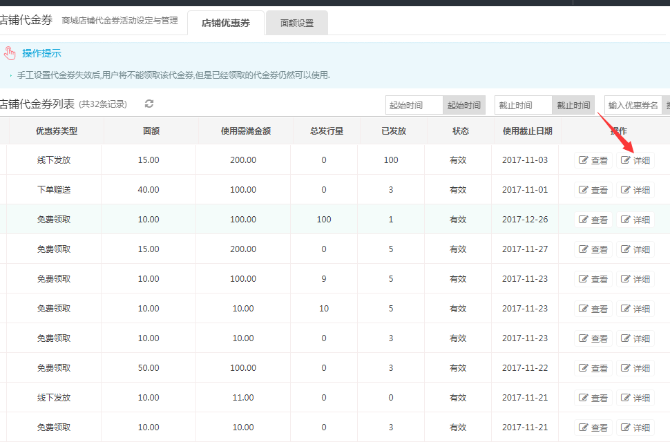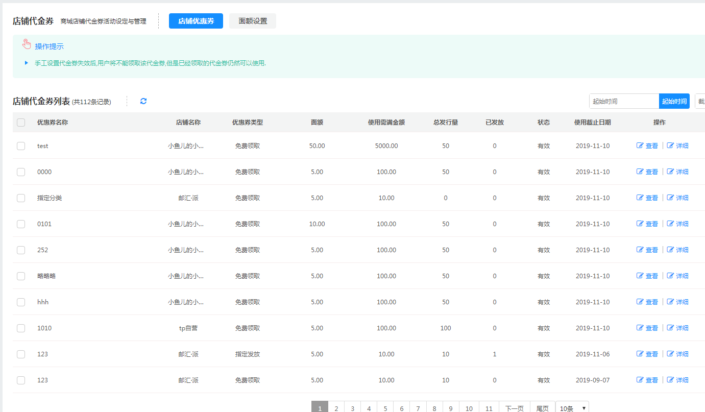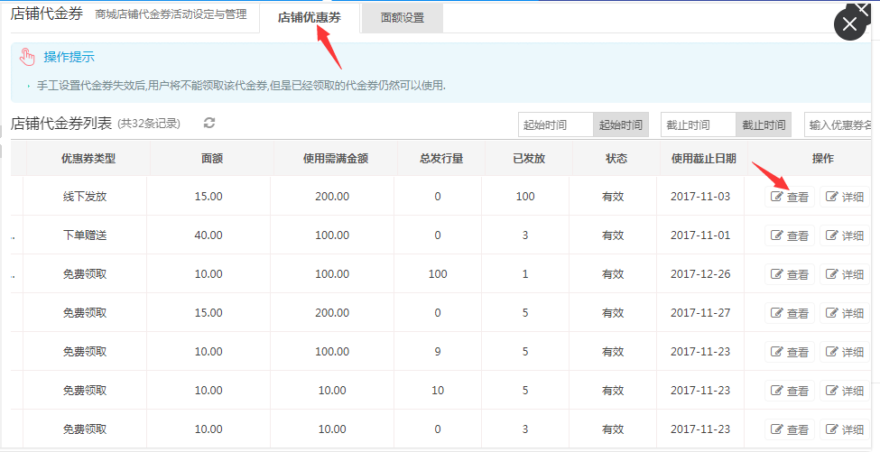 平台管理店铺优惠券,可查看优惠券详情但是不能编辑优惠券信息。
