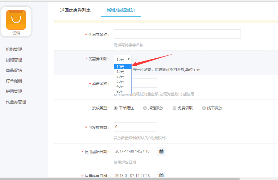 平台位置:营销--优惠券