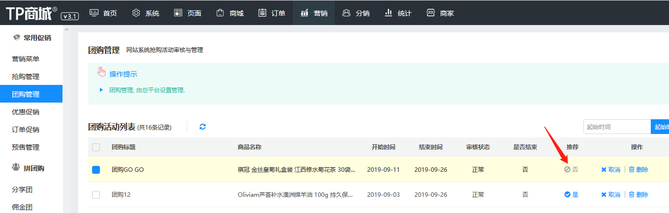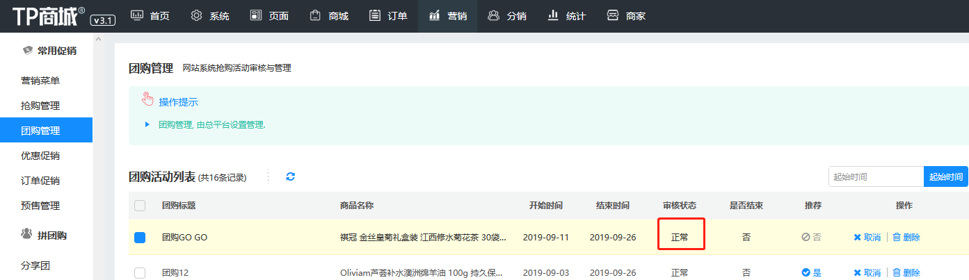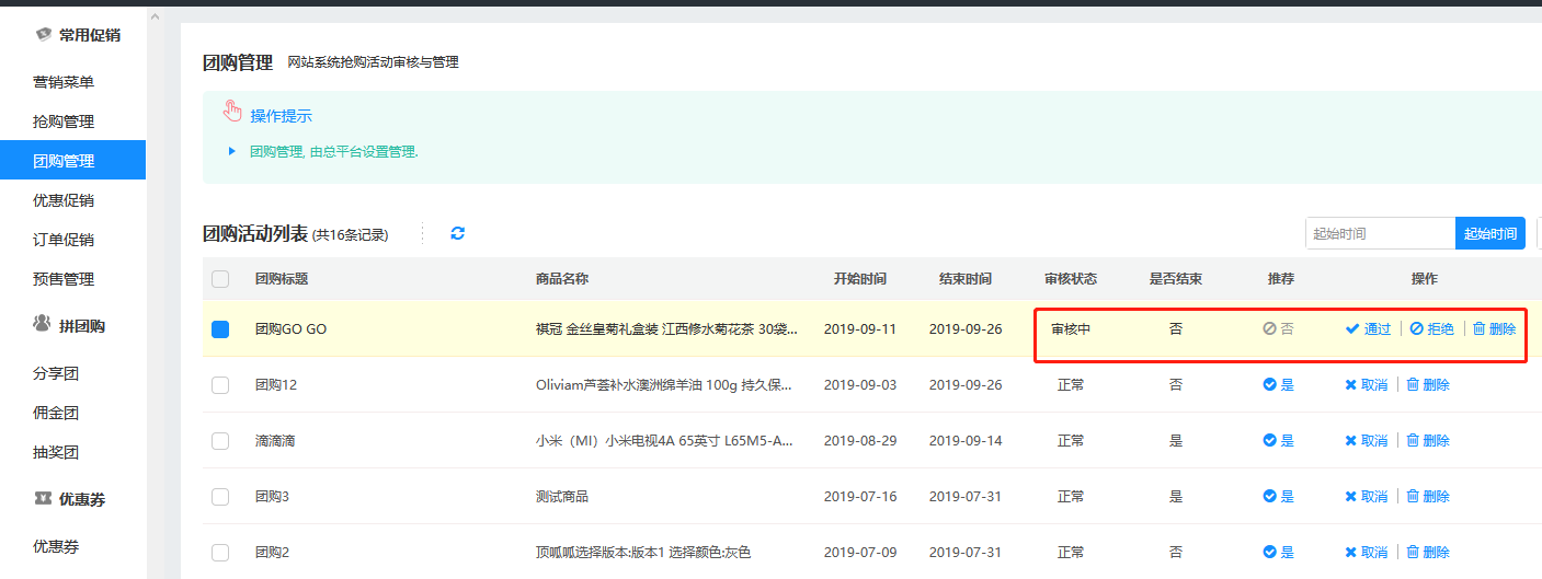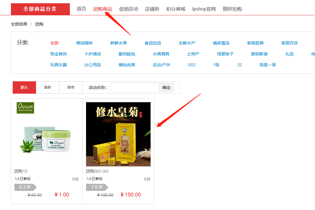 在总平台审核团购活动成功以后,前台就可以以团购价购买该活动商品,但是如果需要显示在商城团购页面,需要总平台推荐
