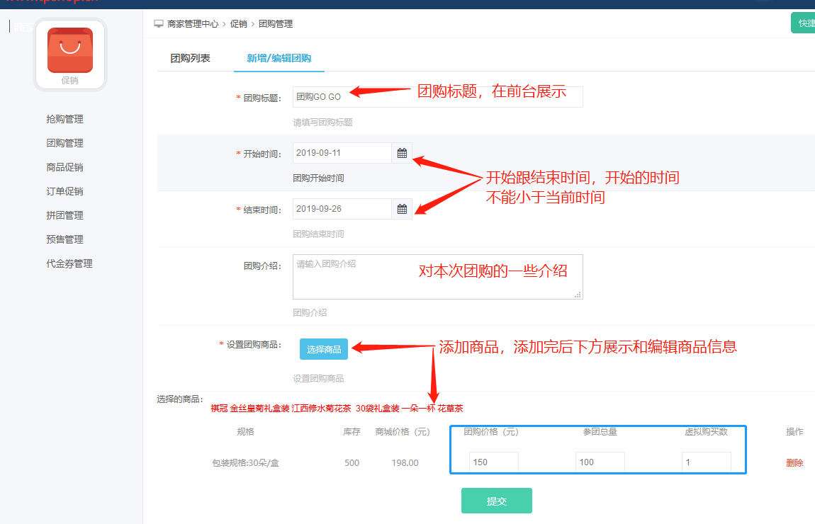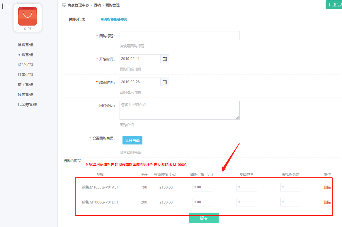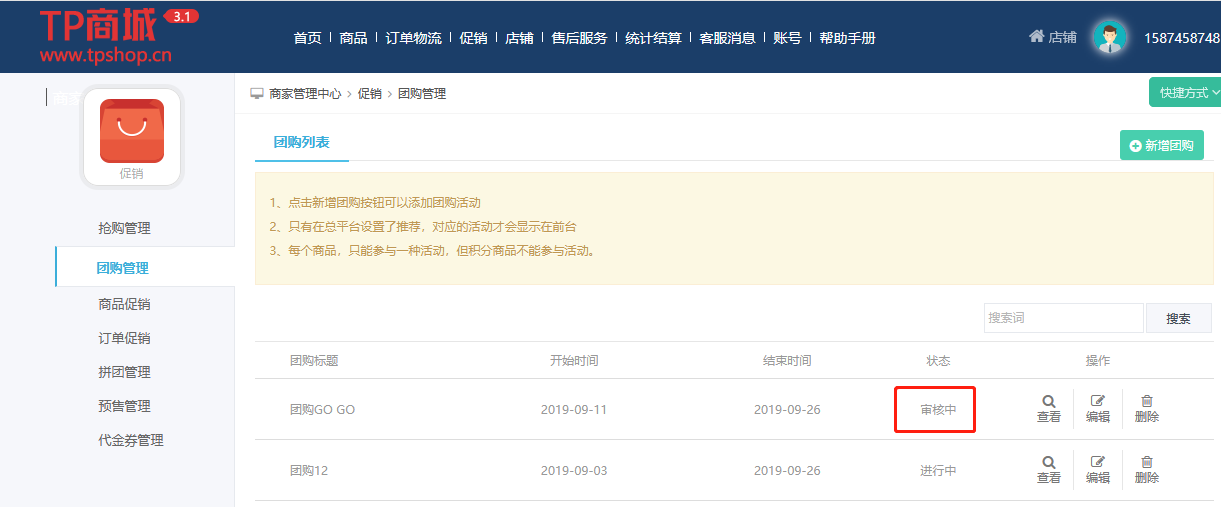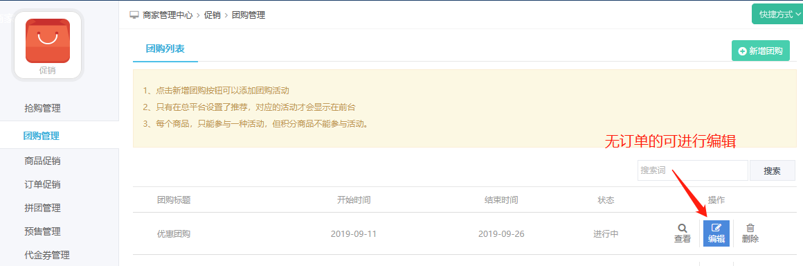 3、团购活动编辑(有订单的不能编辑,没有订单的可以编辑),编辑完后还要到后台重新审核。