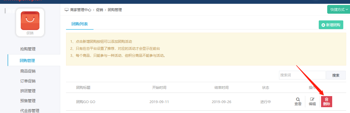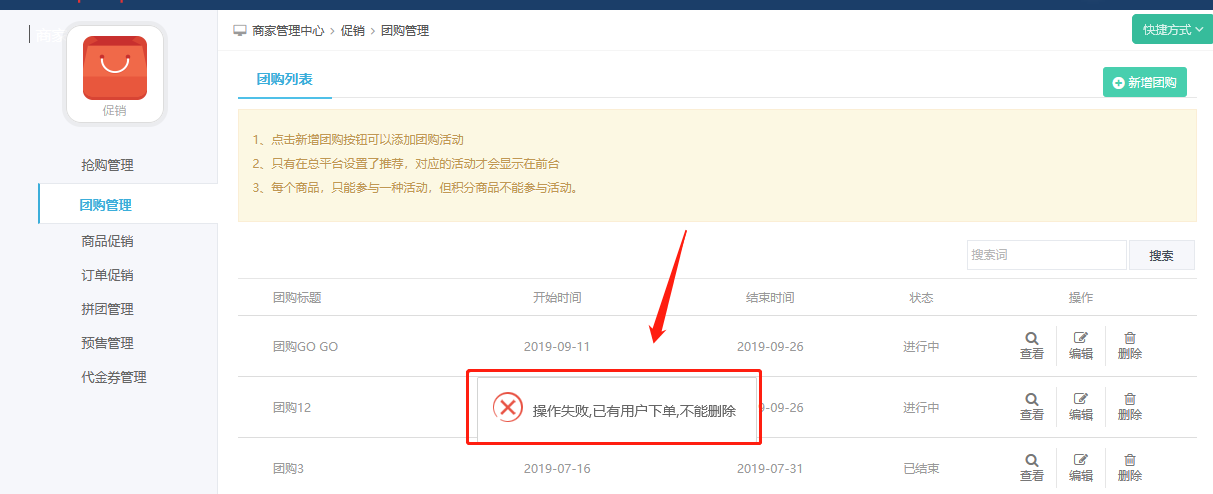 2,团购活动删除(有订单的不能删除,没有订单的可以删除)