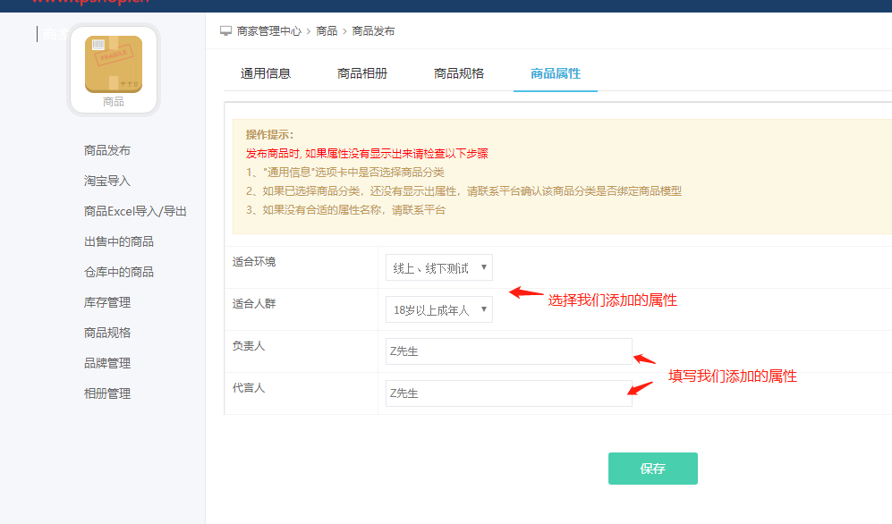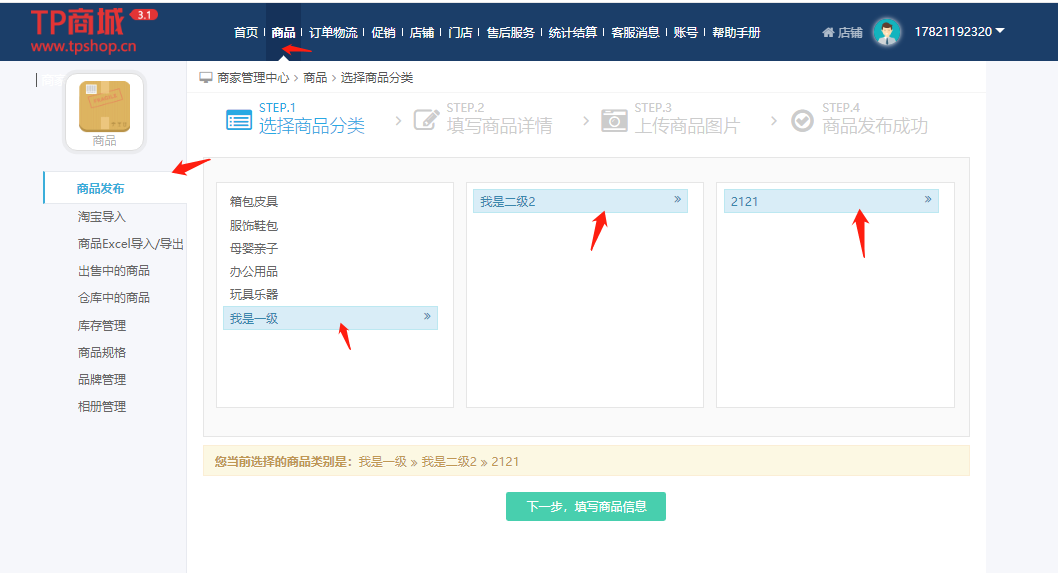 登入商家后台——添加商品发布——选择我们所添加模型的商品分类