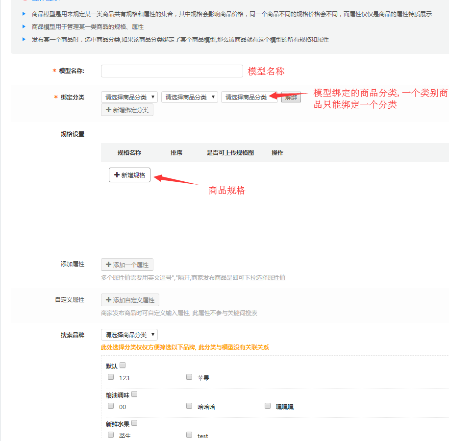 商品模型是将同类的商品规格和商品属性集合起来,比如服装分类的规格,可以创建一个模型为“服装类”。