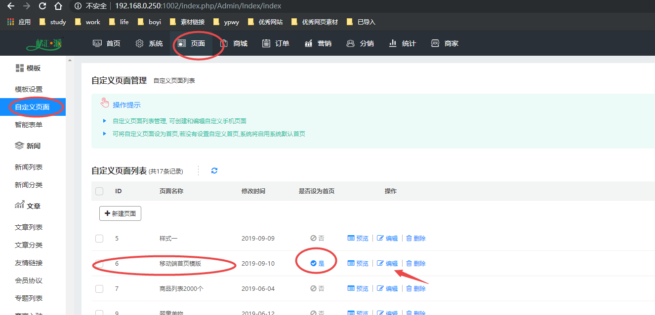 2.单商家:(总后台-页面-首页装修)选择一个自定义页面后,点击编辑按钮,进入到自定义界面,随后操作步骤和多商家类似!!