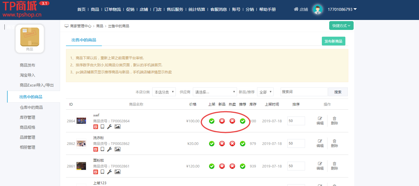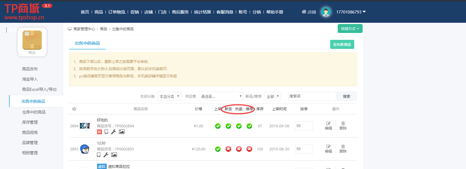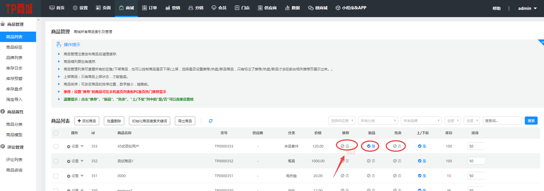 商品标签有三种:推荐,新品,热卖(单多商家一致)