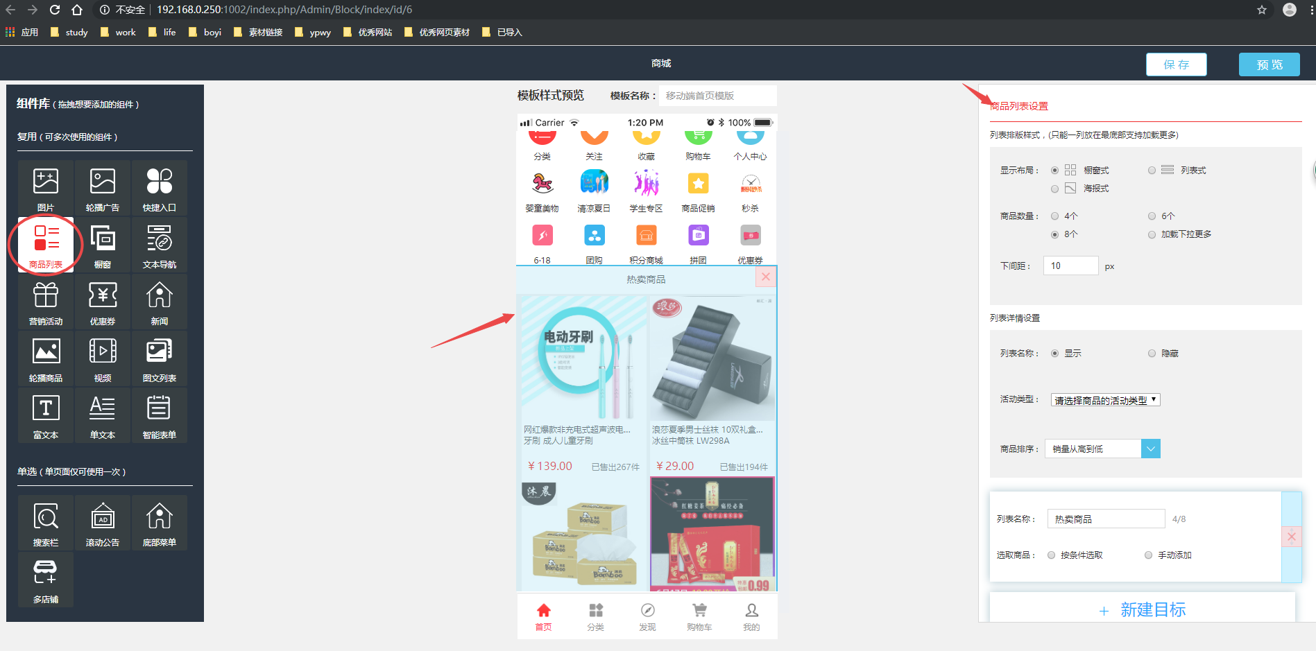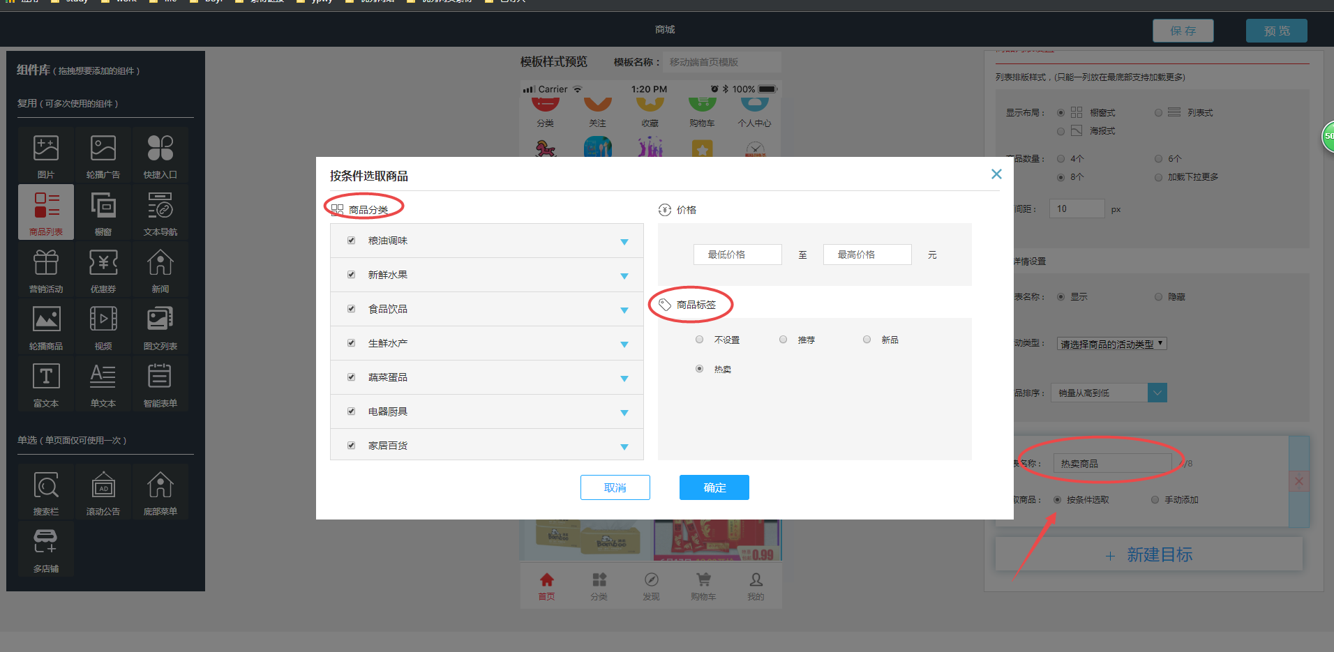 再把“商品列表”组件添加到自定义首页,然后该商品列表名称改为“热卖商品”(名称可以自定义填写),然后选择“按条件选取”,这样你就可以选择不同标签,和不同分类了,这里只选择“热卖”标签,商品分类全部选取(意思就是所有分类商品只要是热卖标签,都会在该热卖商品下显示出来);其他两种标签步骤一样,这里就不再赘述!