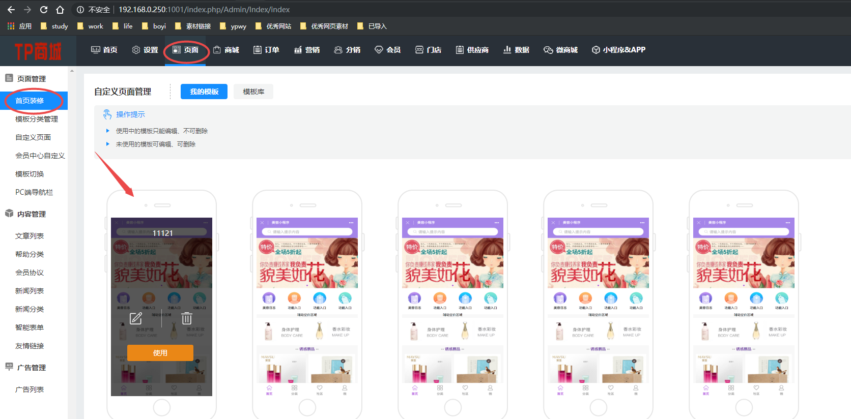 1.多商家:(页面-自定义页面),选择一个自定义模板;点击“编辑”按钮,就进入到了自定义界面!