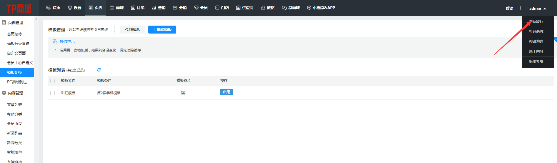 启用以后,需要先清除后台的缓存,再去前台查看。如图: