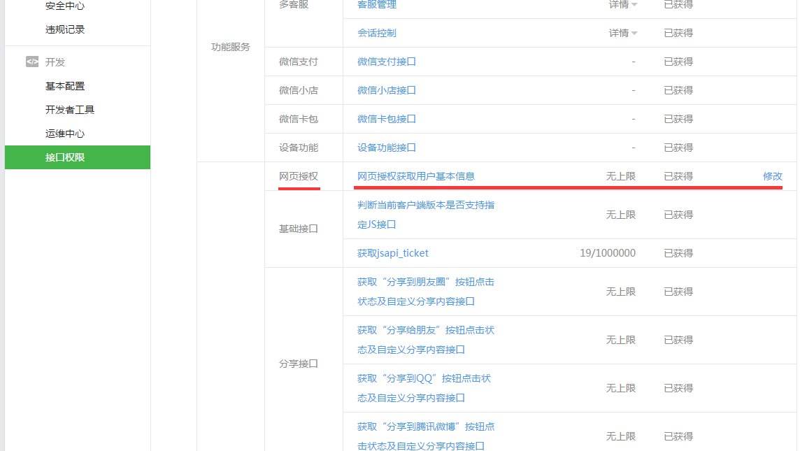查看方法: 微信公众号后台 -> 开发 -> 接口权限-> 网页服务 -> 基础接口 -> 网页授权获取用户基本信息