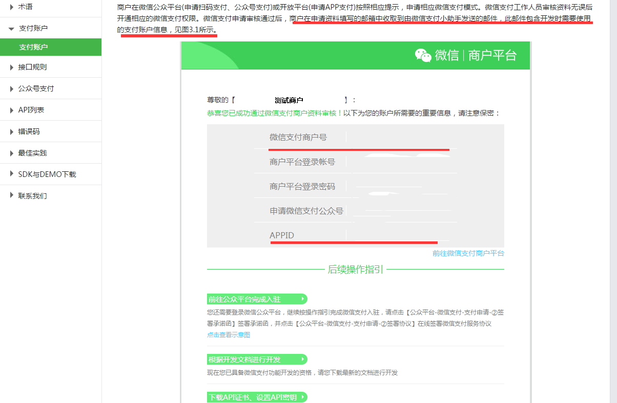 APPID和商户号:在你申请微信支付的时候会收到微信发来的邮箱, 邮箱里面包含了这些信息(如下图):