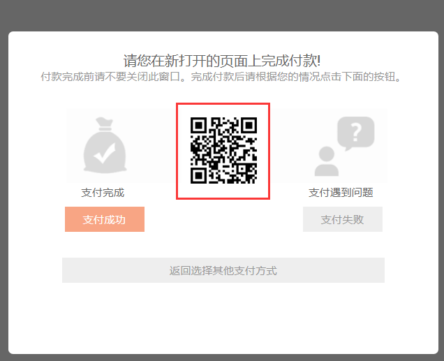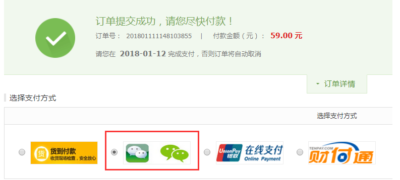 配置完成之后, 用户在商城下单进入支付页面, 选择微信支付微信即可扫描支付