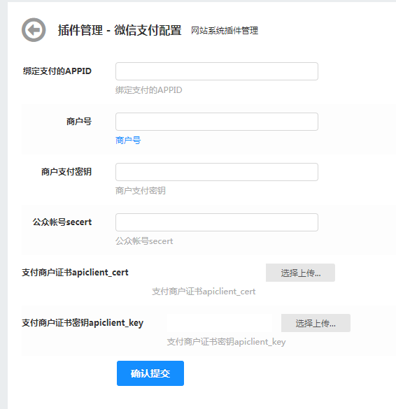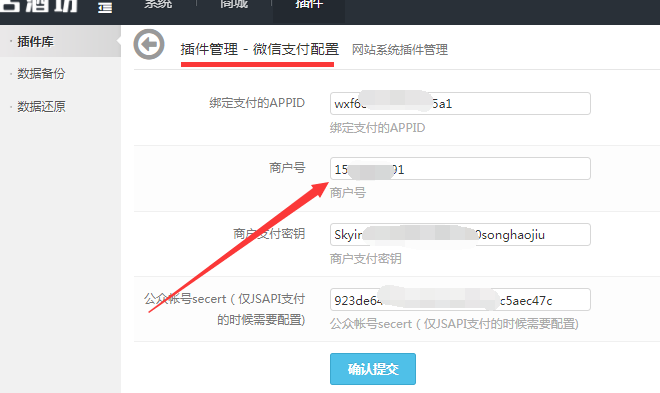 第四步:在网站管理后台插件列表中找到微信支付插件,配置支付参数,4个参数全部要填写正确,保存成功就配置完成了。