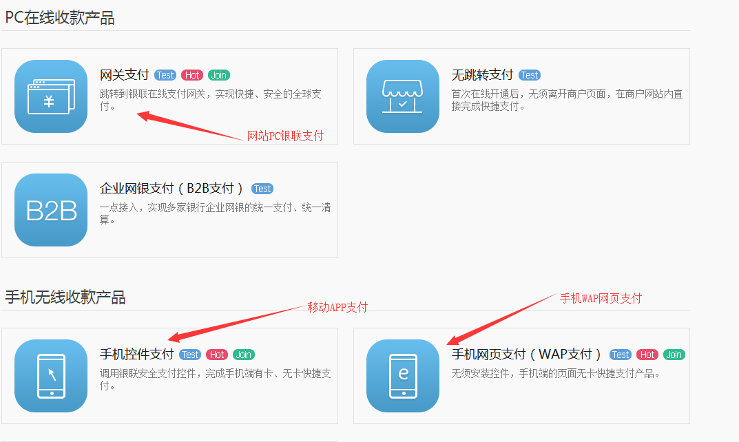 网管支付: PC网站支付; 手机控件支付: 移动APP支付; 手机网页支付: 手机WAP网页支付.