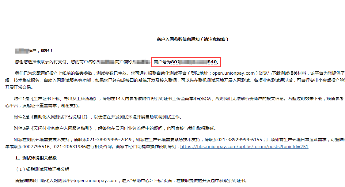 审核完成,收到一份来自银联的邮件, 里面包含了商户信息以及接入流程