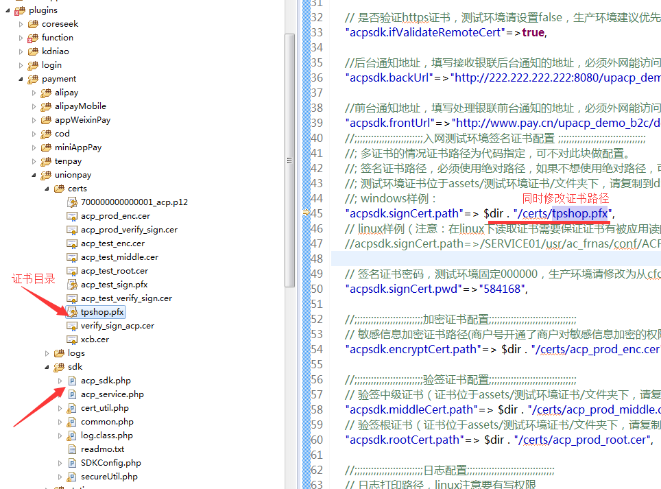 同时, 将生成为后缀为".pfx"的证书文件上传项目的"pluginspaymentunionpaycerts"目录