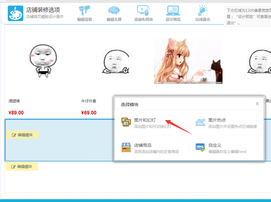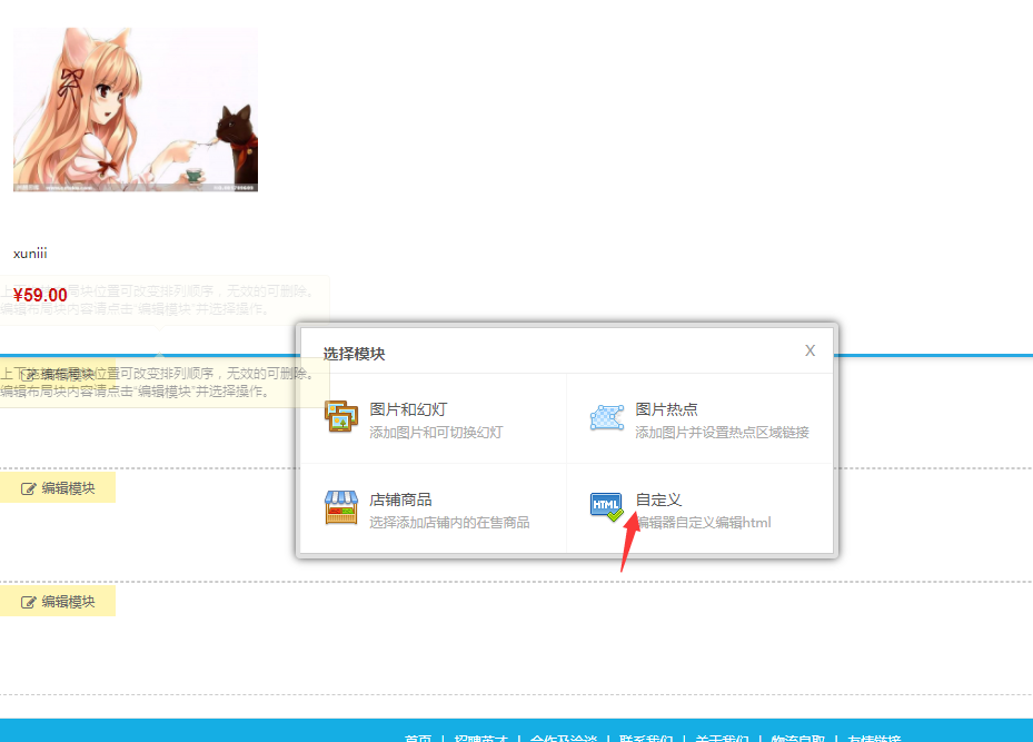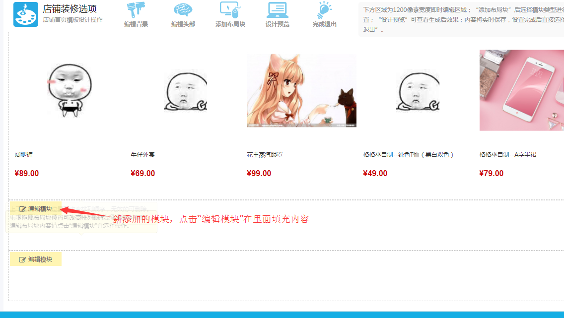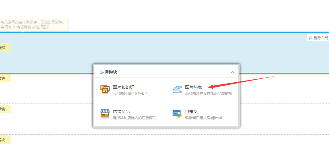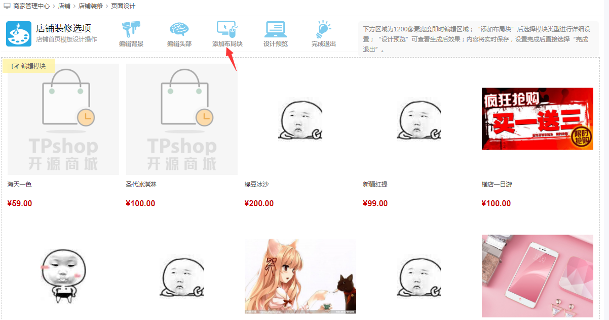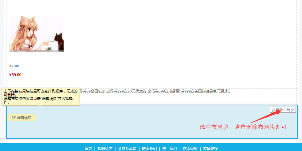 点击添加布局块,就会添加一个新的布局块,用户可自定义在里面加入图片或商品或者其他等等。