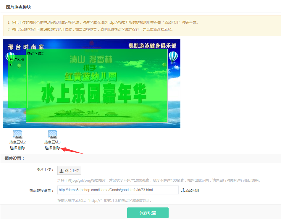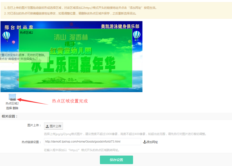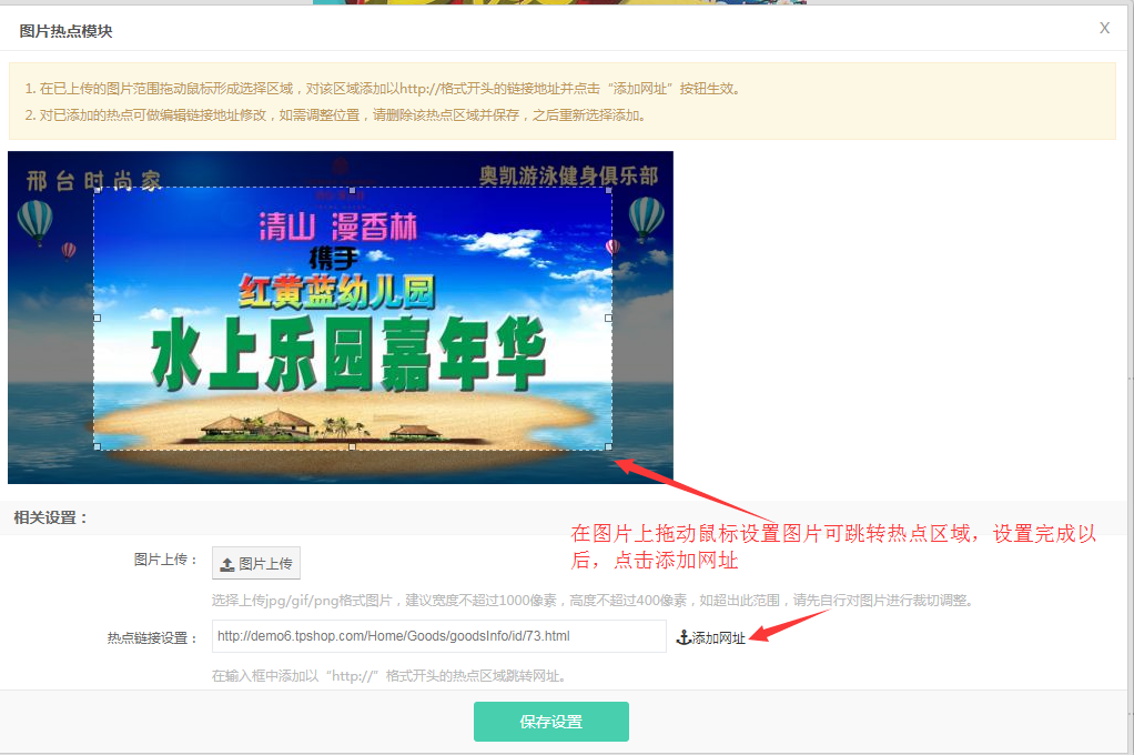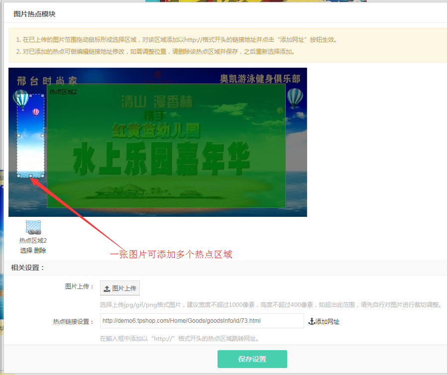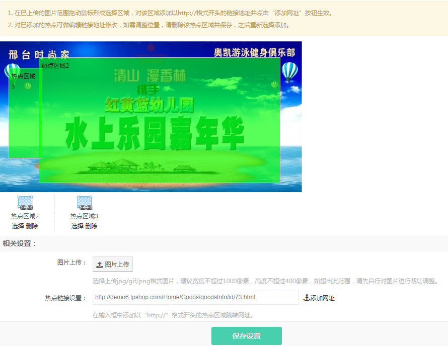 在上传好图片以后,可以指定图片热点区域。在热点区域点击热点链接,可跳转到对应的链接。
