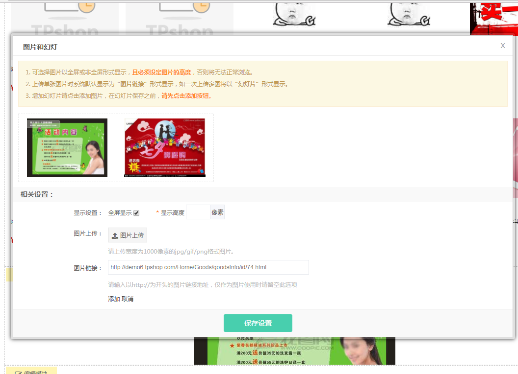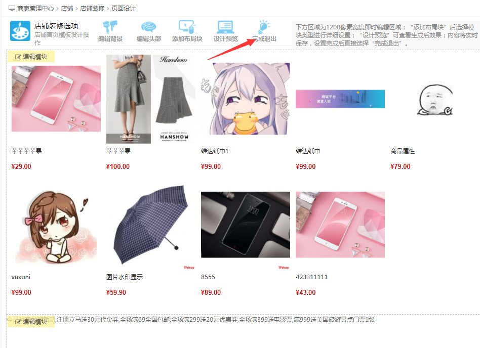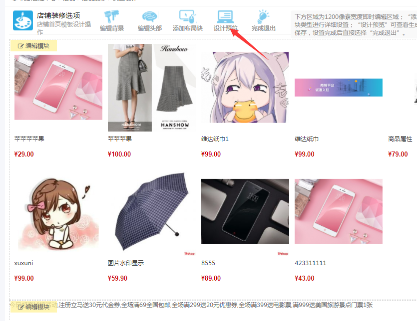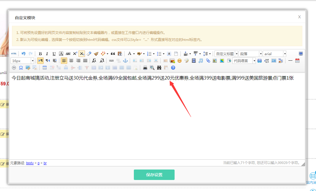 自定义编辑模块可做图文详情,店铺活动页面设计广告页面,也可以只编辑文字,做公告使用。