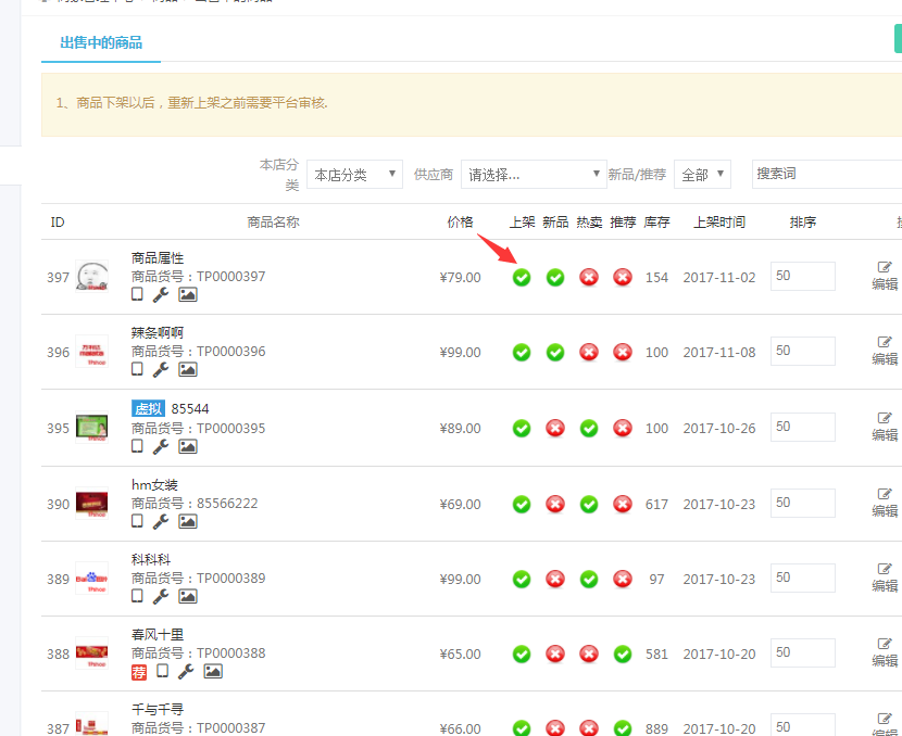下架以后,商品直接跳转到仓库中的商品。
