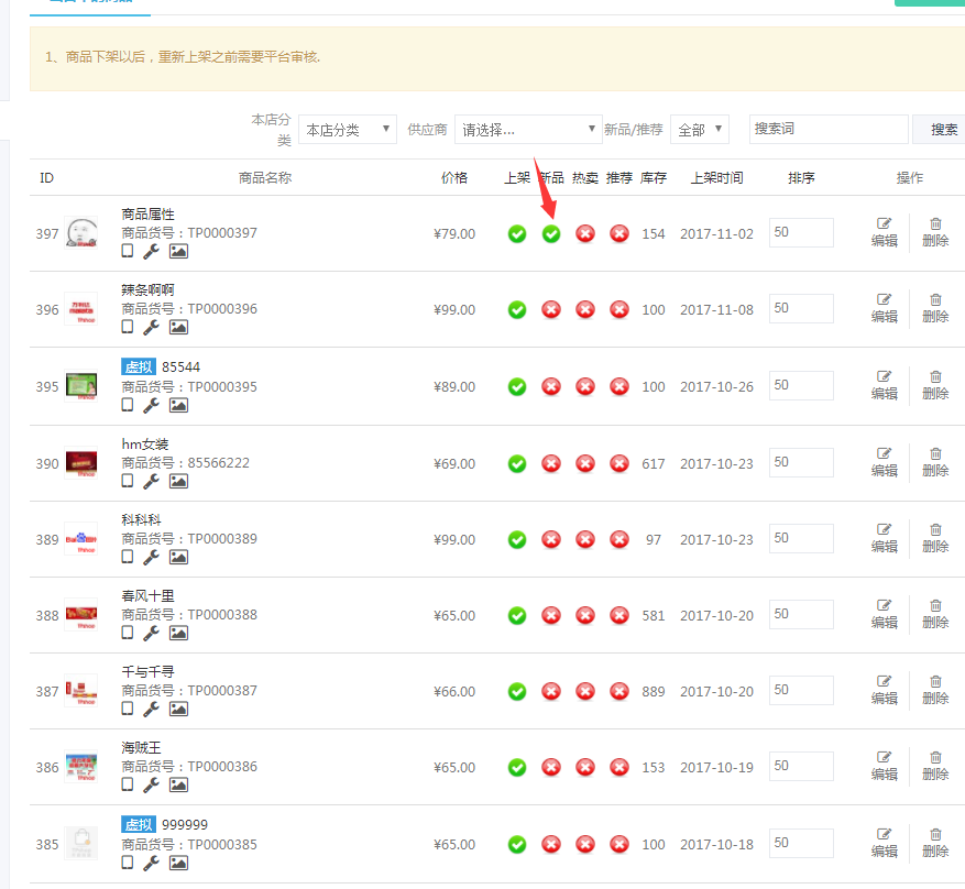 商品上架以后,商家可管理新品/推荐/热卖商品,维护以及删除商品。