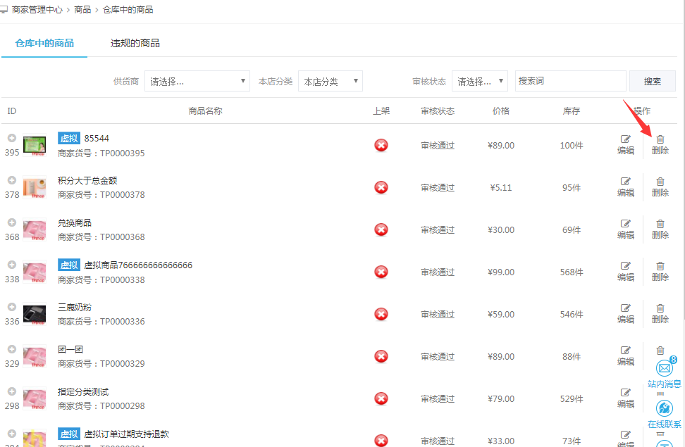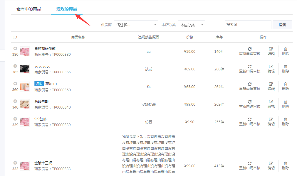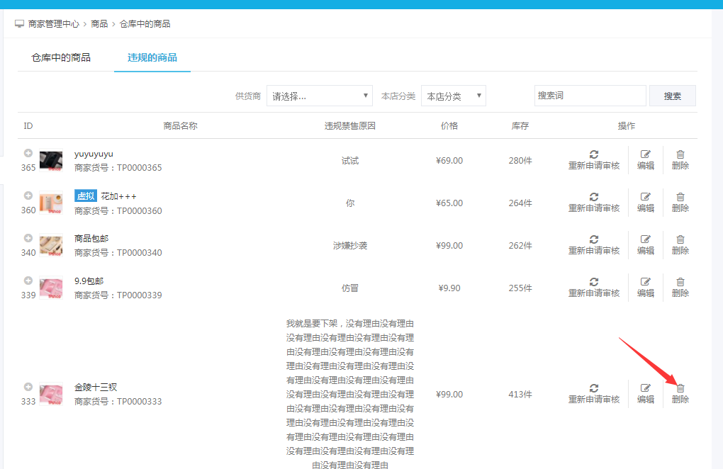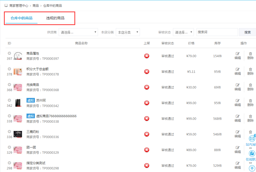 仓库中的商品主要是管理商家自主下架或者平台强制下架的商品,分为两部分仓库的商品和违规的商品。