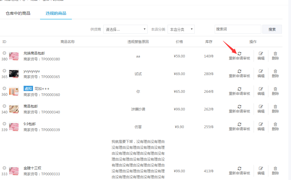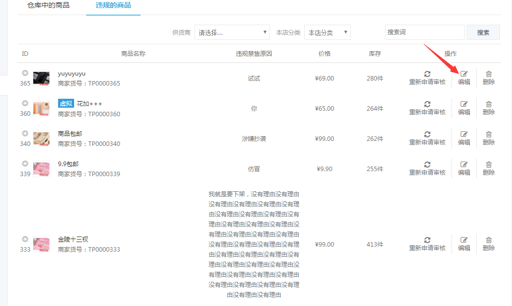 在重新提交审核之前需要先把违规商品相关信息重新编辑