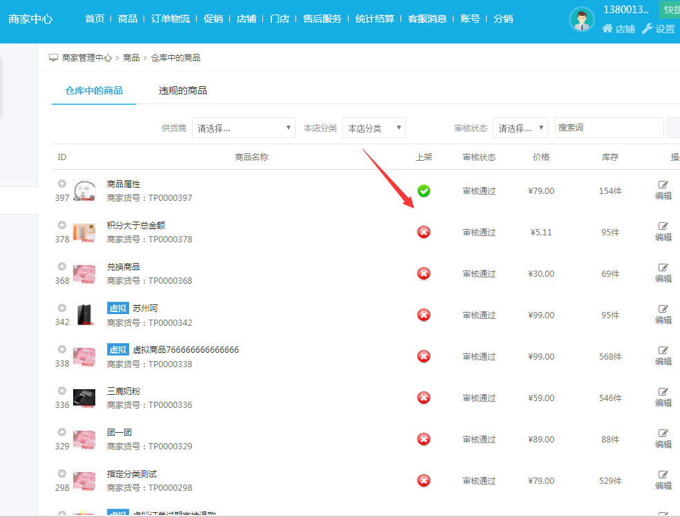 直接点击上架下的按钮即可完成上架操作,上架的商品就能在商城售卖了。