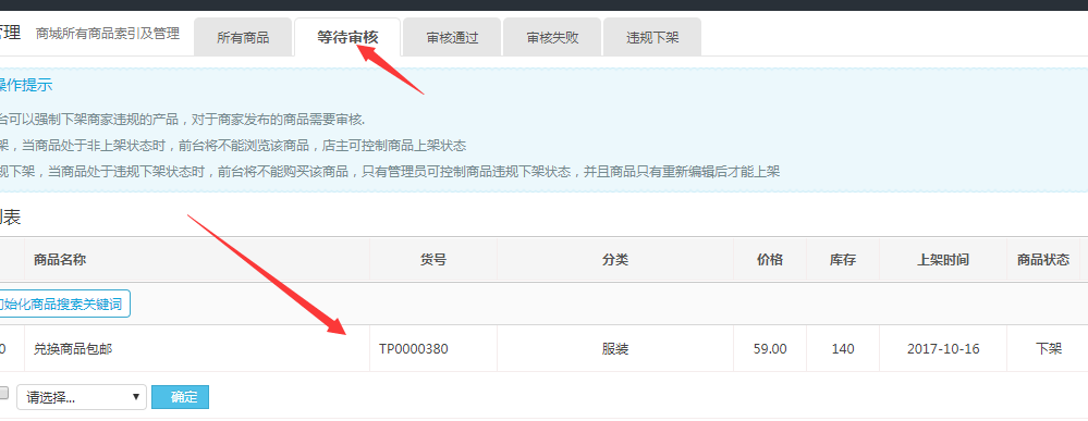 提交以后,商品待审核状态,提交到(总平台--商品管理--等待审核)列表,待平台审核。