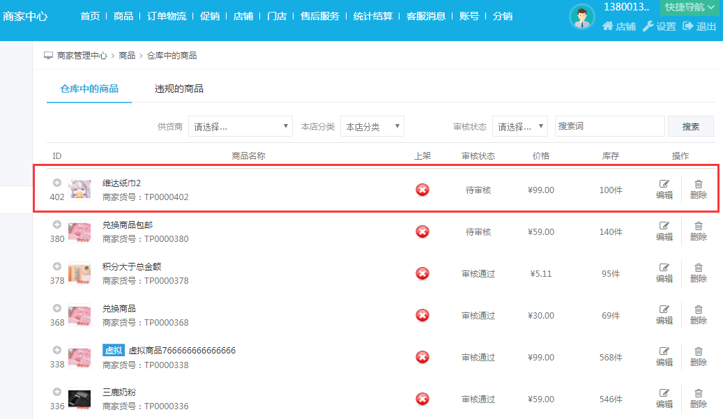 商家添加好的商品,进入到仓库中的商品,商品状态为待审核