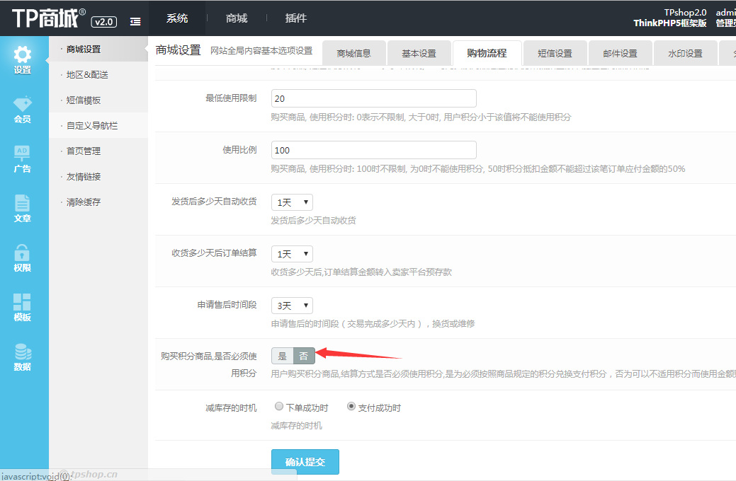 当选择“是”的时候,用户积分值不足时不能购买该商品。