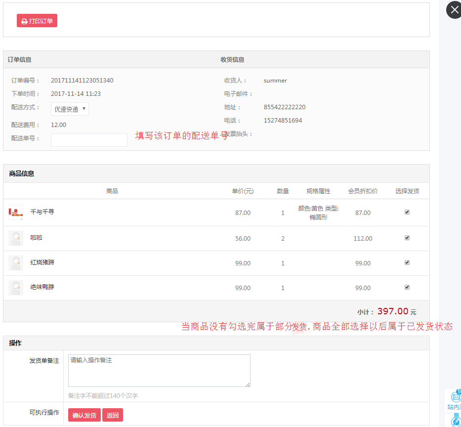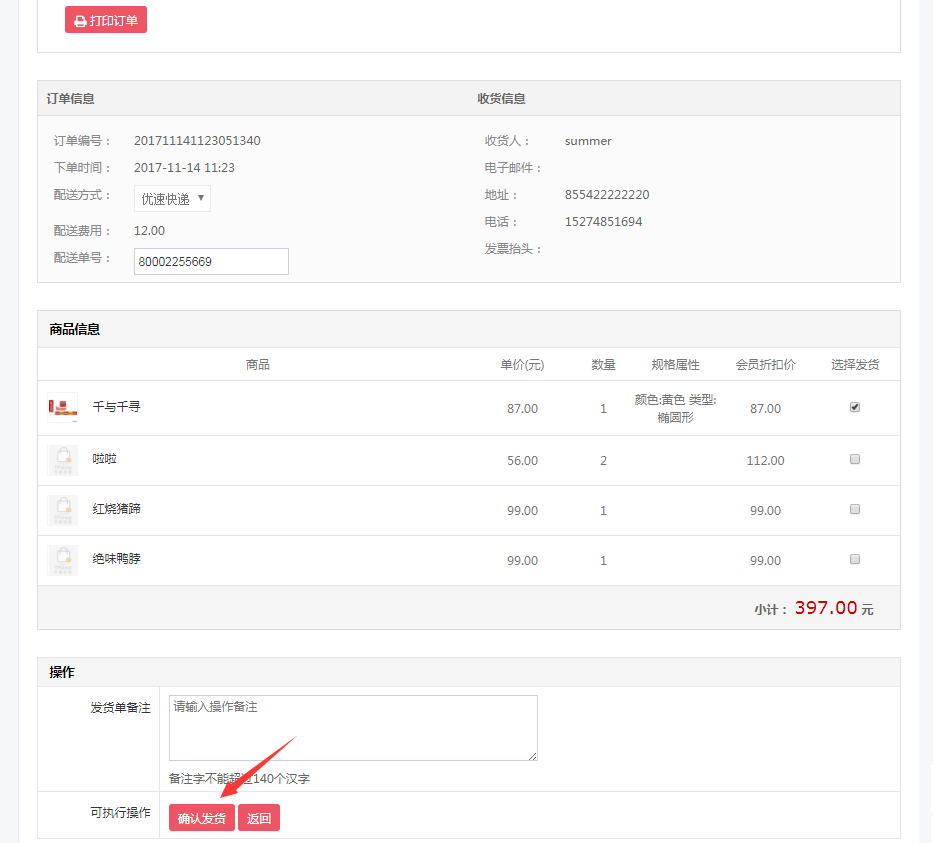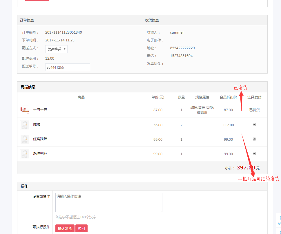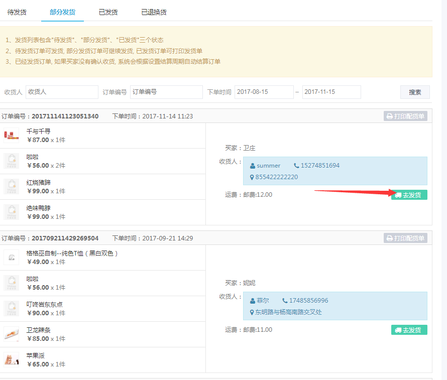 商家在订单列表将订单确认以后,就在发货商品进行发货操作。