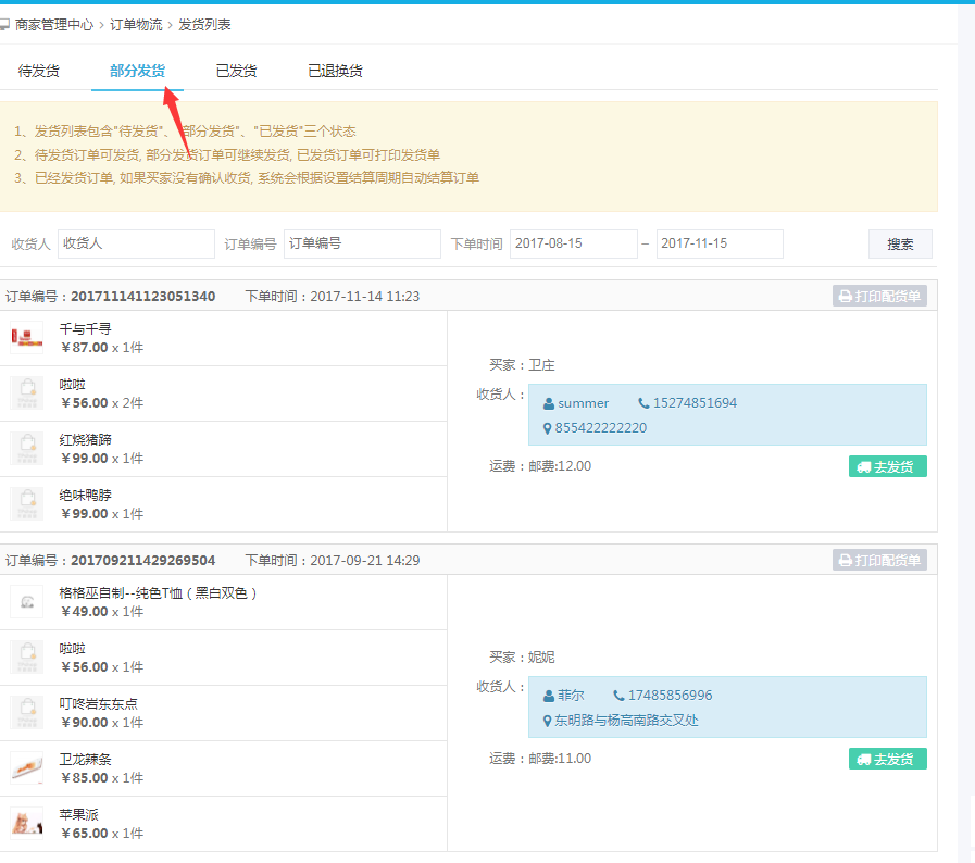 所以在部分发货列表里可以找到这笔部分发货订单